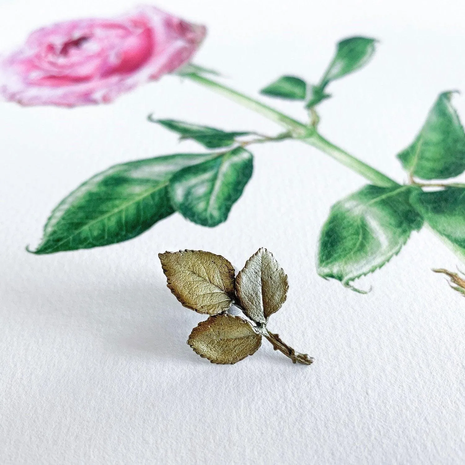 Every collection also includes a matching leaf lapel pin, designed by Michael Michaud. Just as the paintings depict every miniscule facet of the plants, our pins capture the beauty and exquisite detail of nature using soft patinas on bronze. Our unique jewellery is made by creating moulds directly from botanical elements, reproducing them as wearable art that can be purchased in the most prestigious museums in the world.