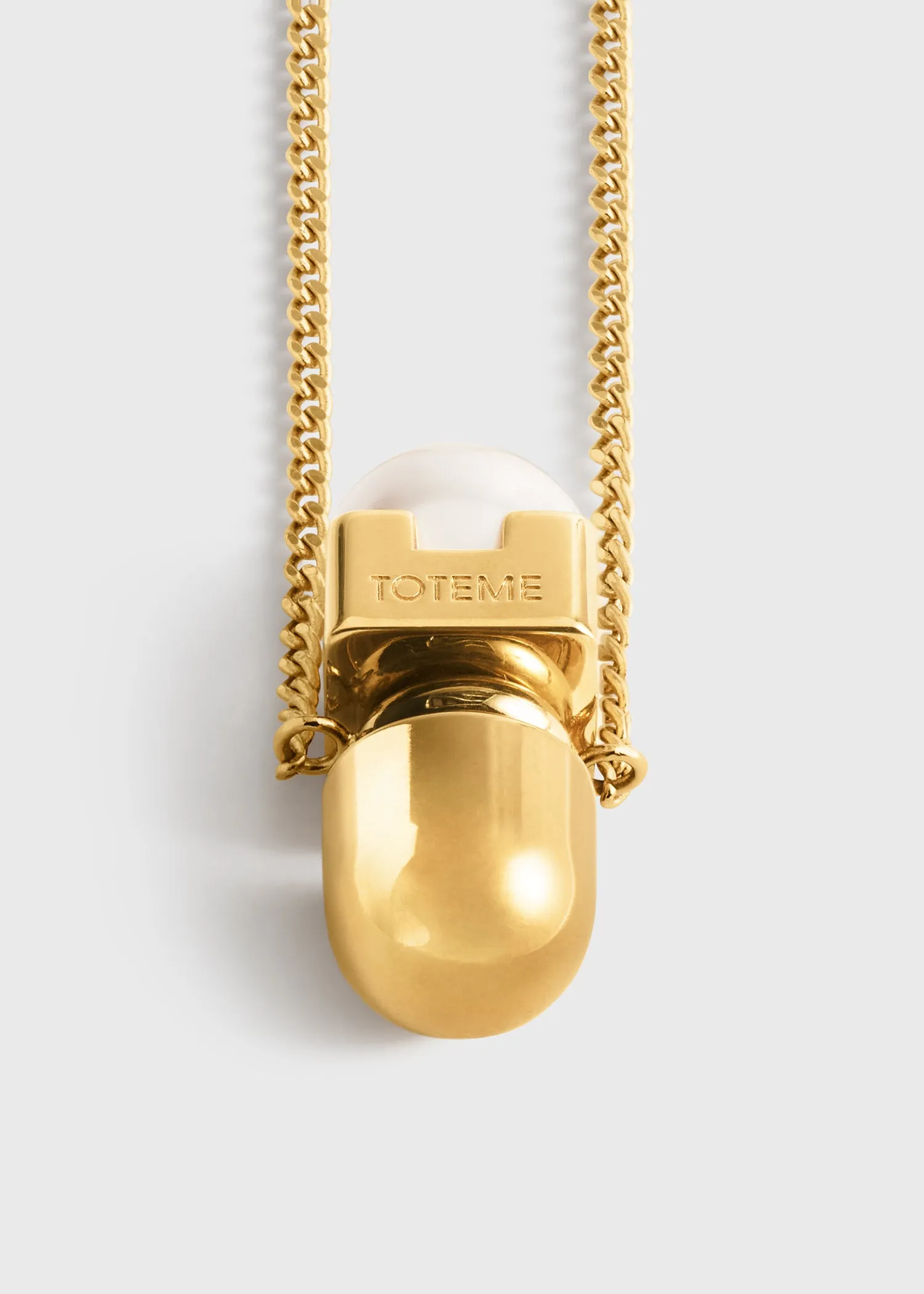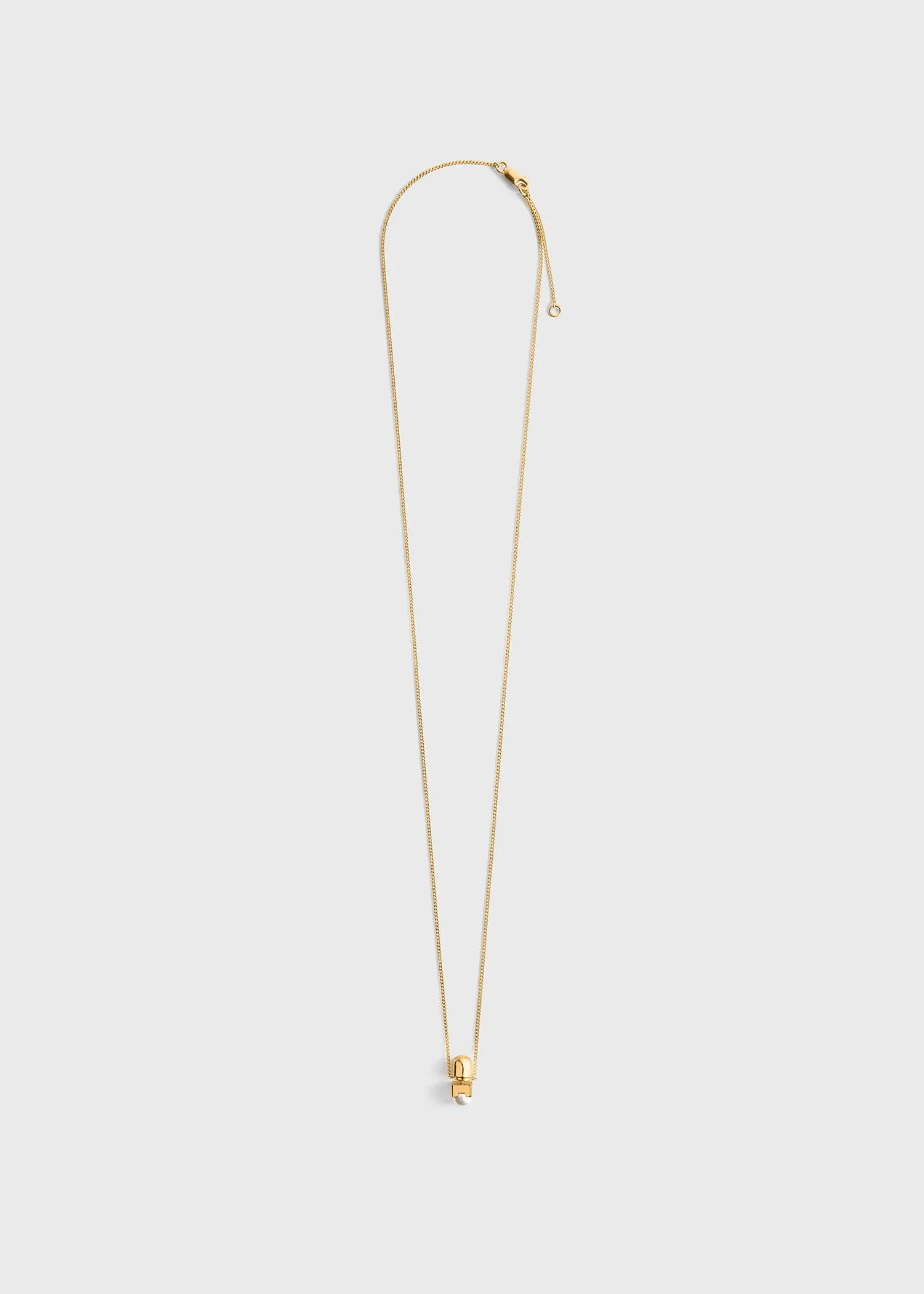 TOTEME necklace featuring a white faux pearl pendant with a vertical, mirrored shape. Made in Italy, it has a long and fine grumette chain that fastens with a lobster clasp to two different lengths.