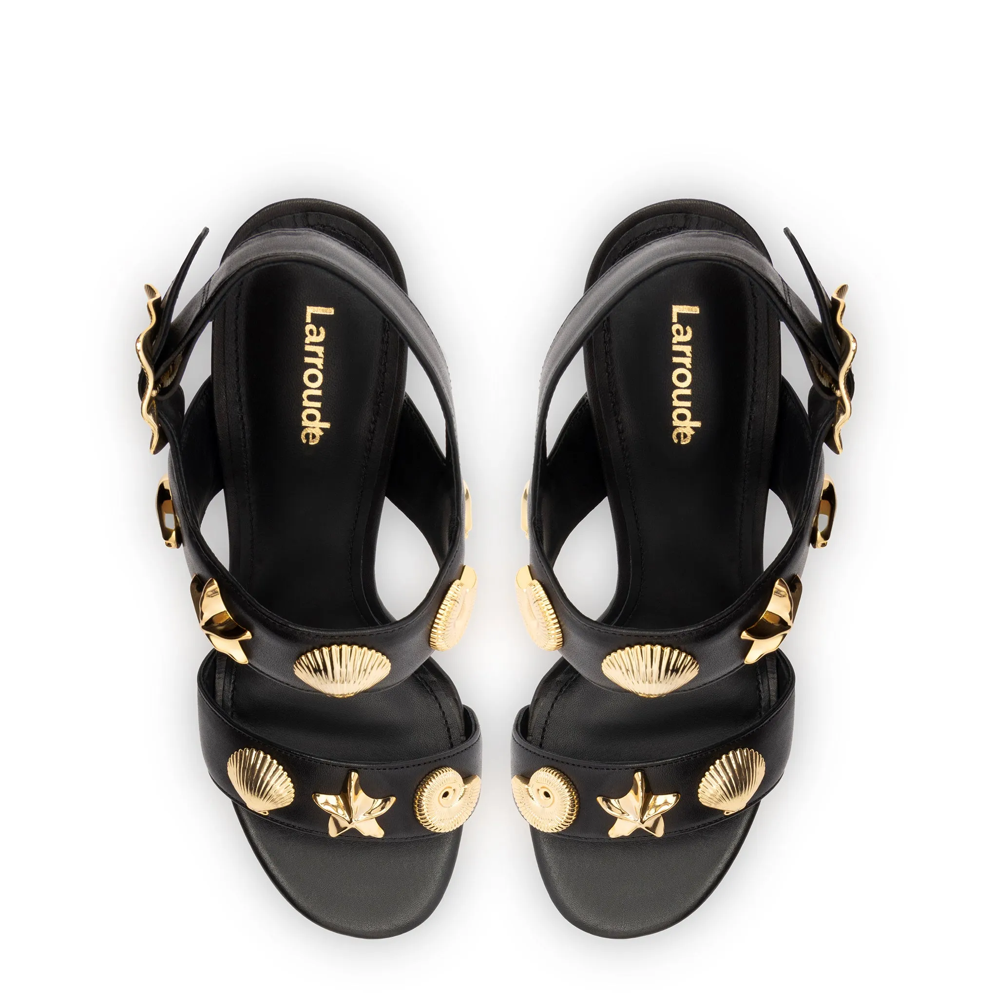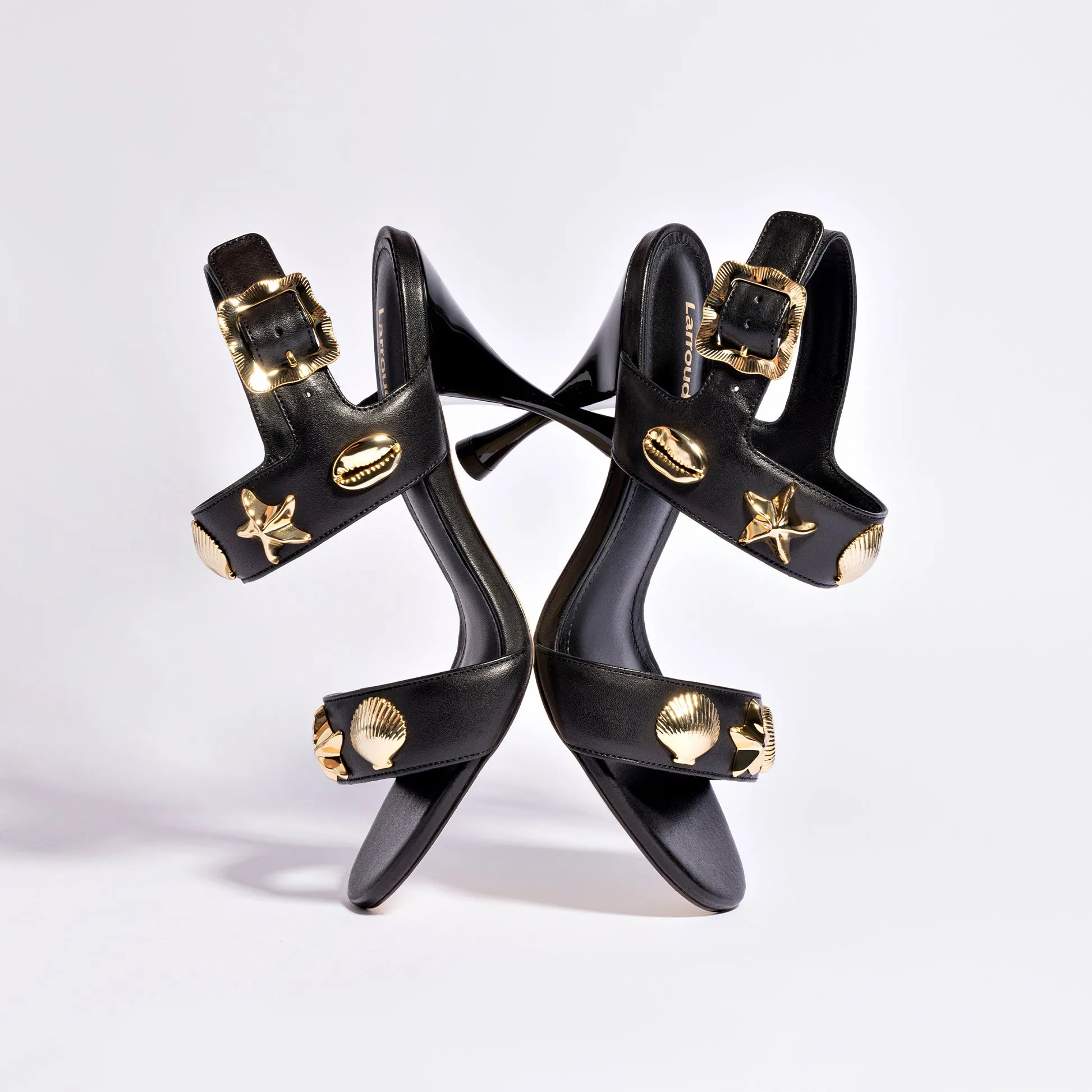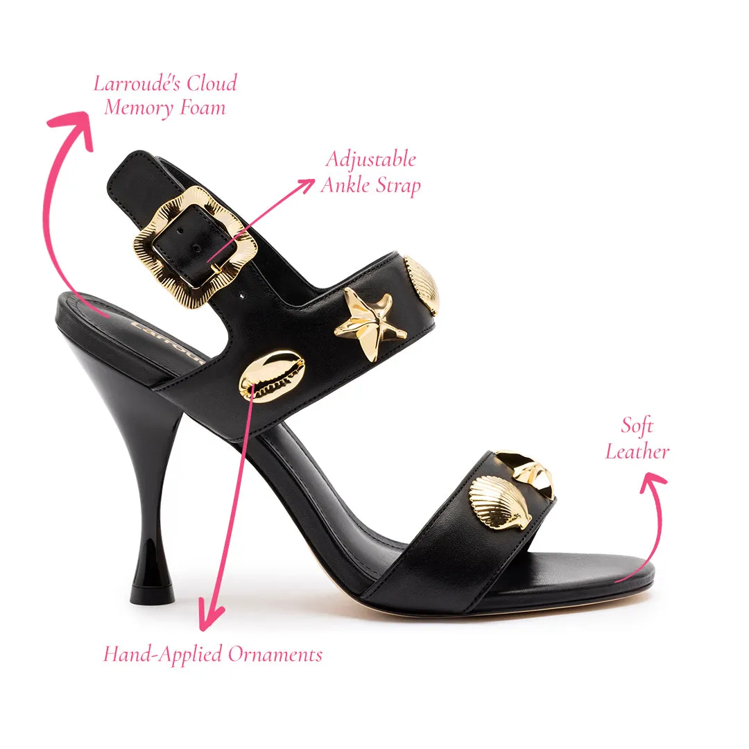 Larroudé sells sea shells by the sea shore, and the new Madison Sandal is reaping the benefits. Meet our newest heeled sandal must-have with festive ornaments and adornments that make the pair unmistakeably ours.