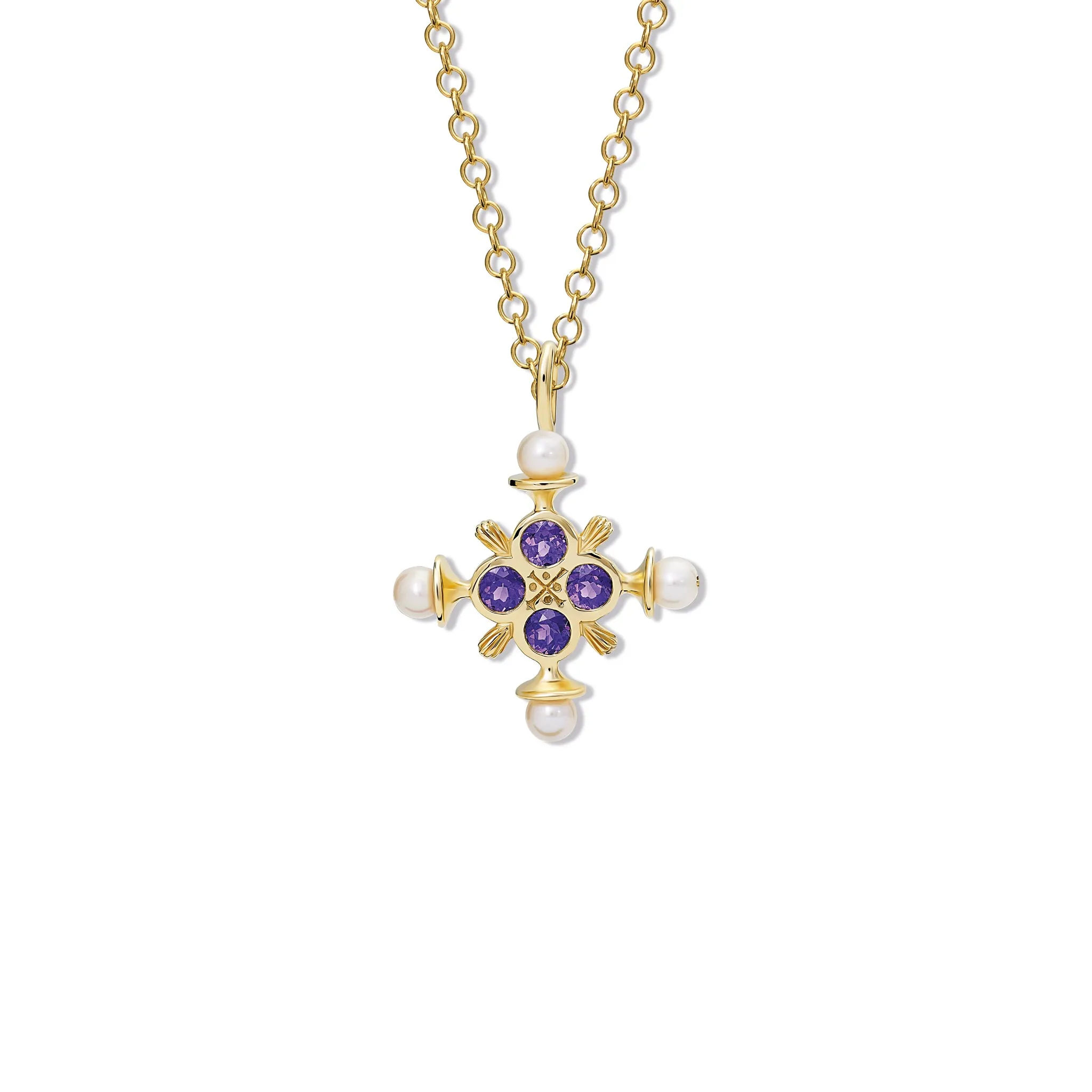 The Madrid cross in yellow gold with amethyst and pearls is inspired by a small flag Cassandra noticed flying outside her favourite pastelería in Madrid. Her quick sketch evolved into the Madrid cross that makes the perfect christening, graduation or even bridal present. The Madrid cross is available simply adorned with pearls or with four birthstones set in its centre. From Cassandra's collection of Crosses.