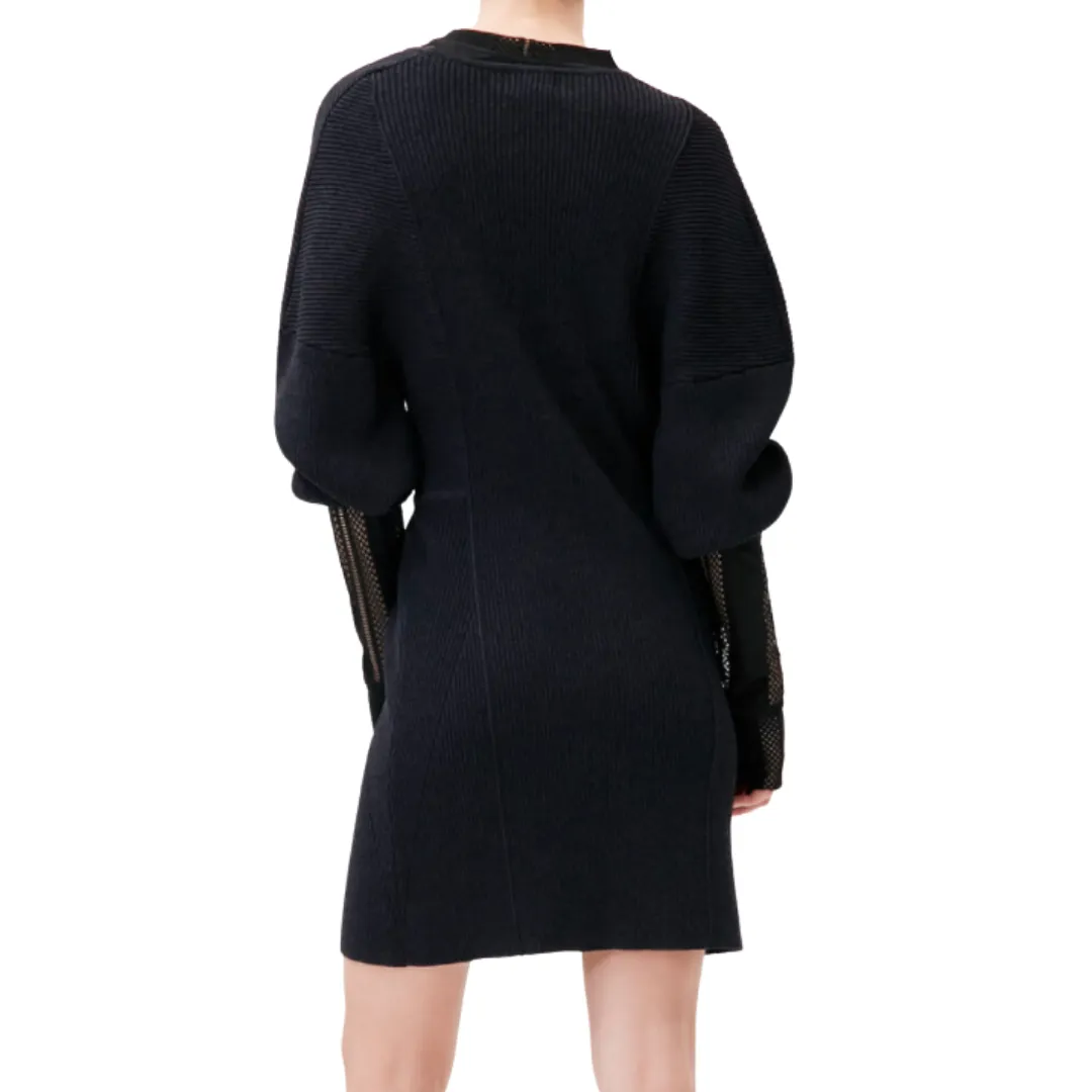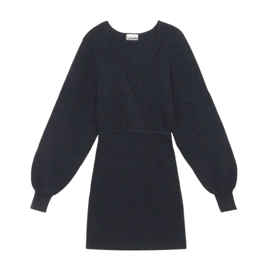 The perfect day-to-night dress, this is a basic knit body-con mini dress featuring a wrap-style V-neckline and statement long cuffed balloon sleeves.