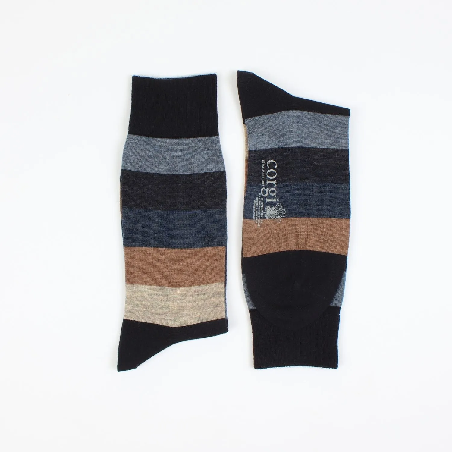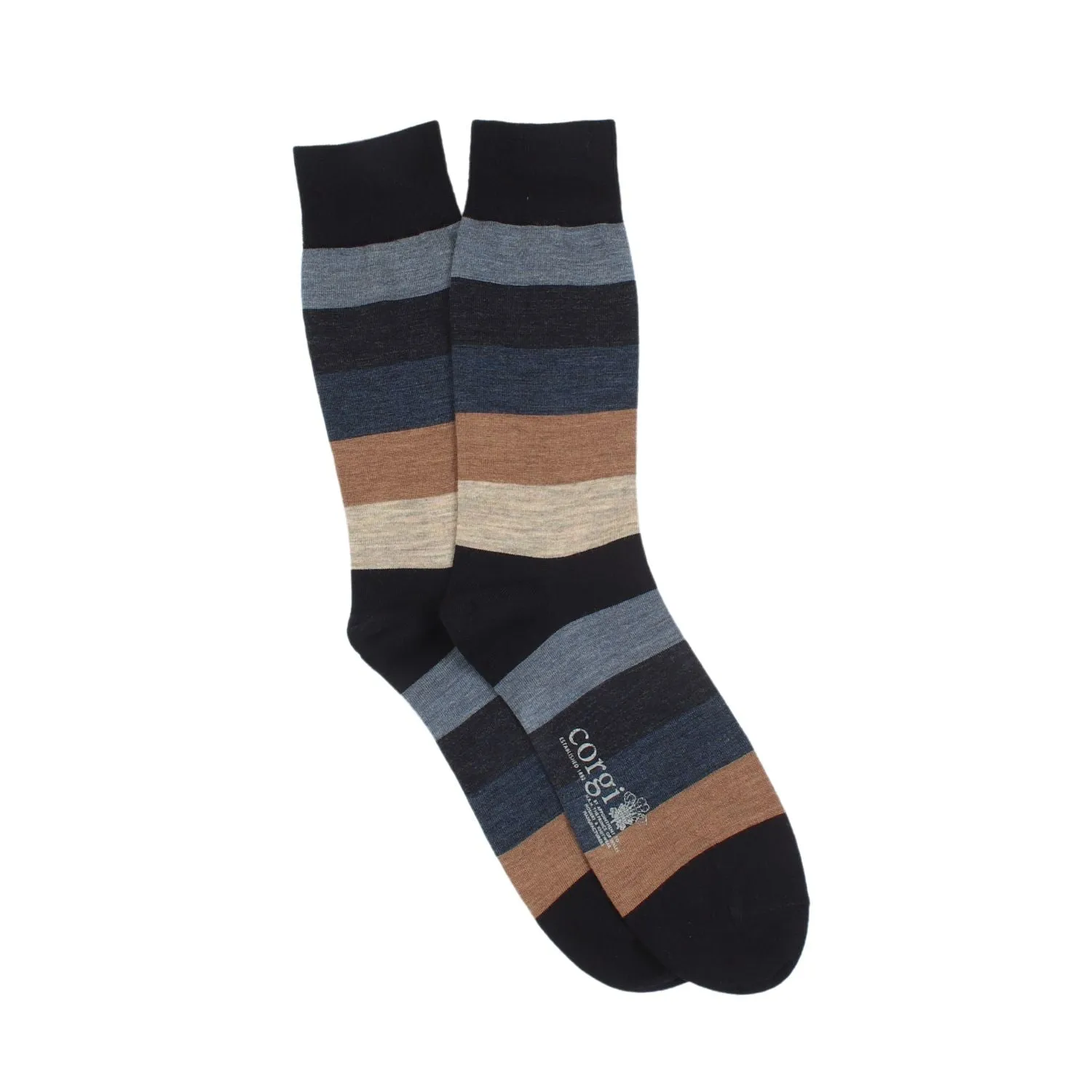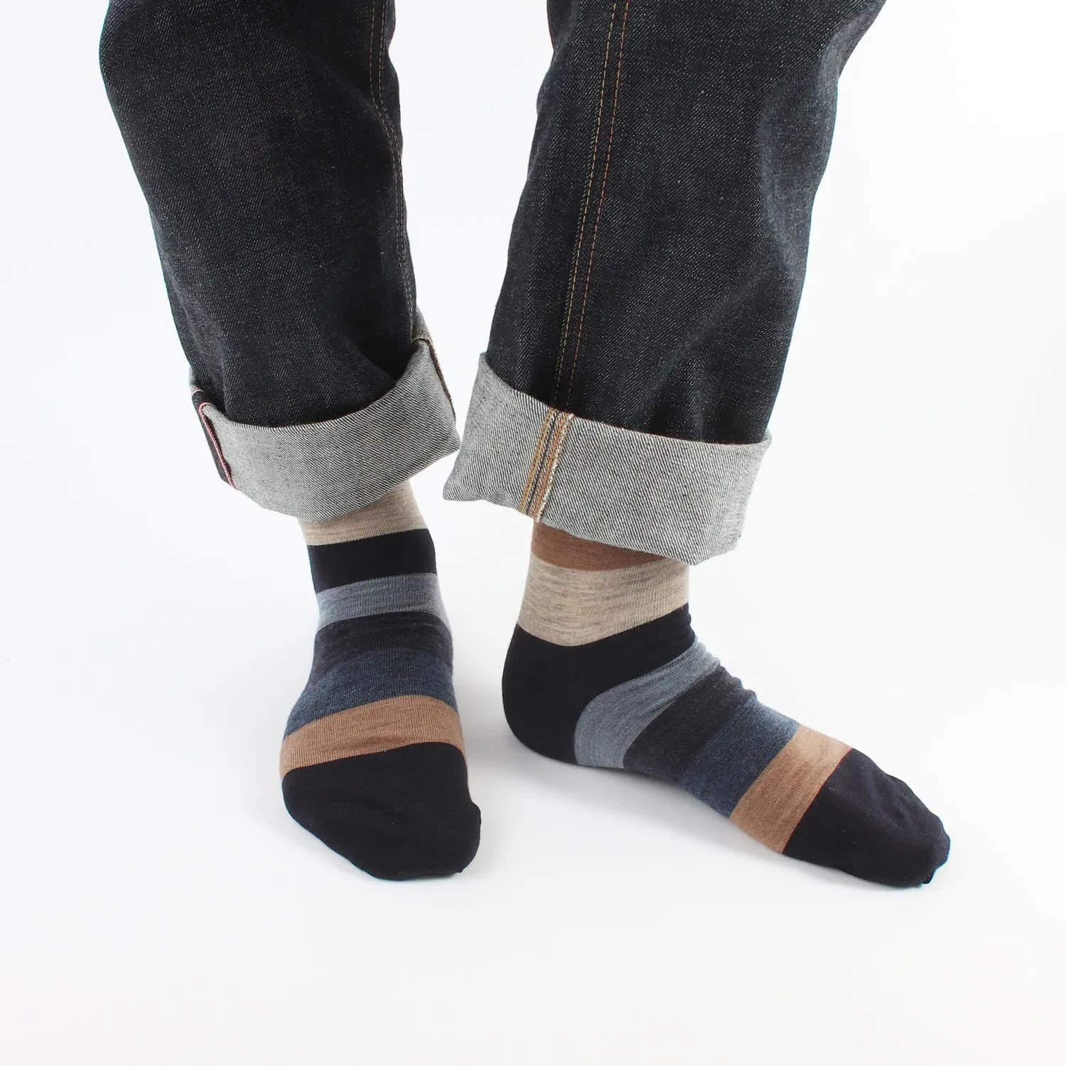 These men's striped super fine merino wool socks provide lightweight luxury with a colour block design full of rich, complementary tones. Embrace the warmth and cosy feel of wool and step out in style this season.