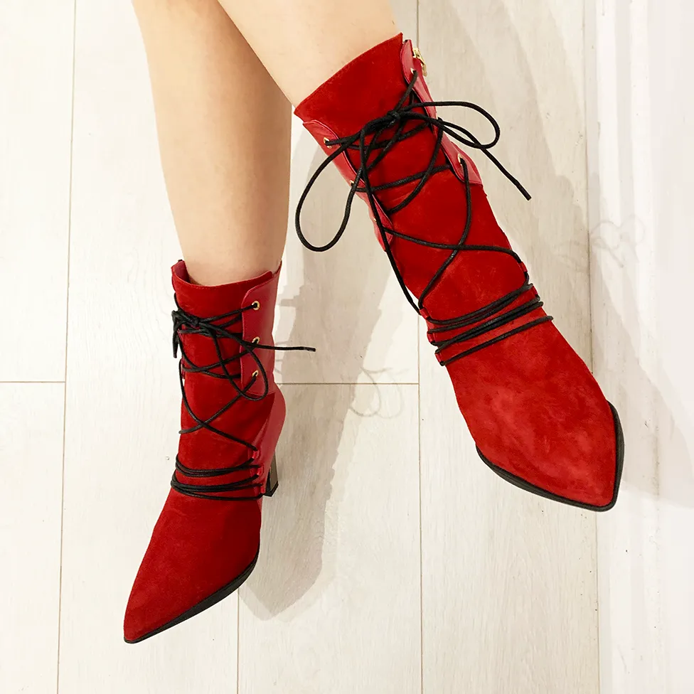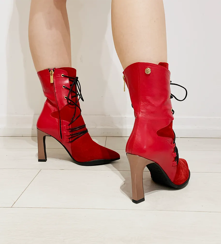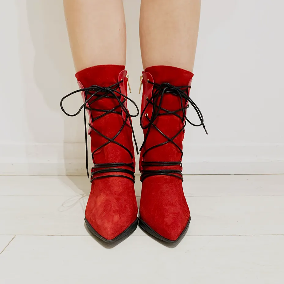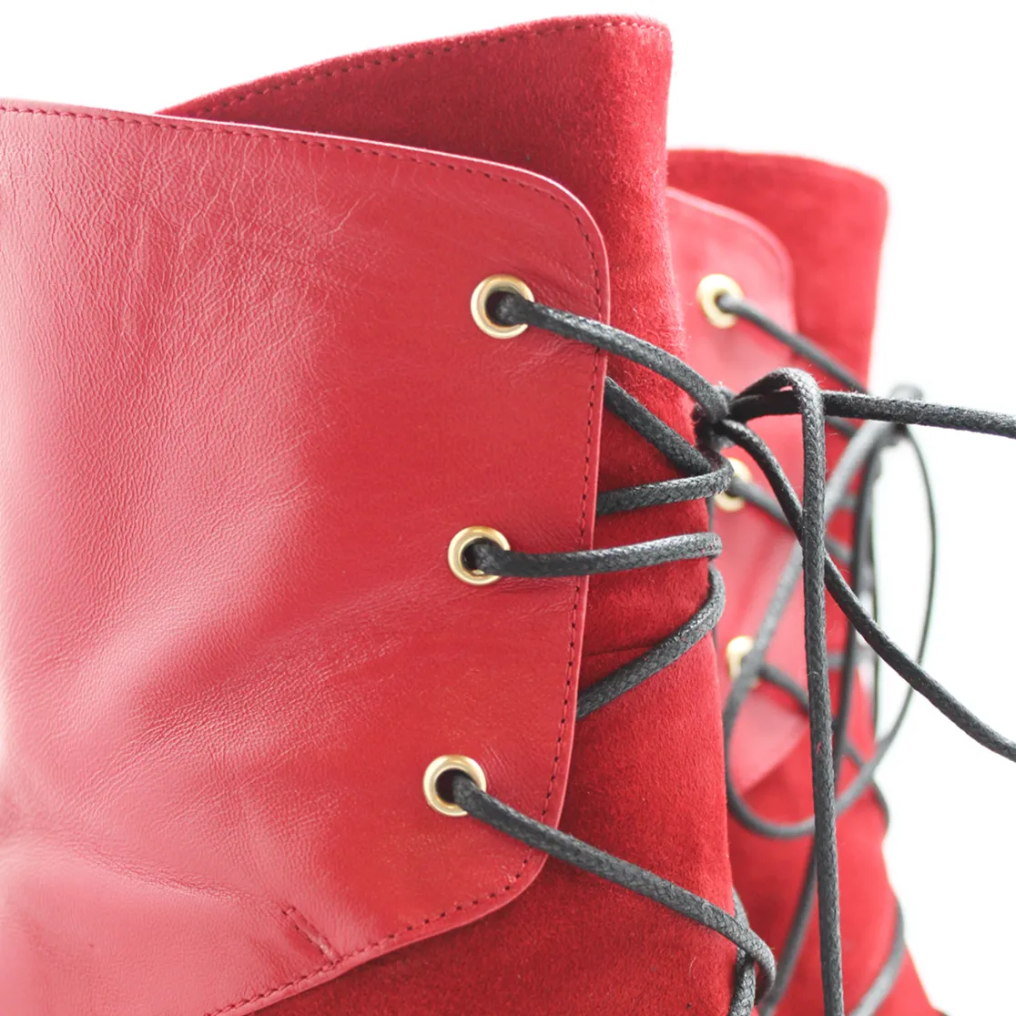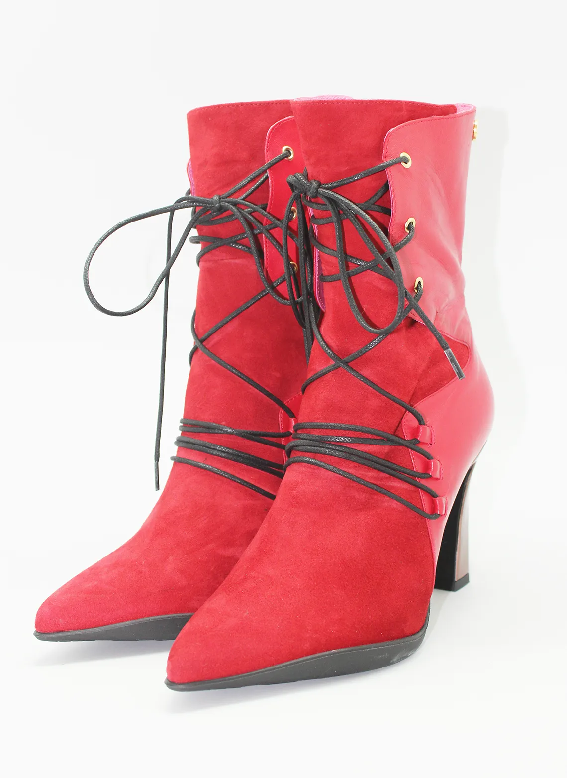 Stunning sexy and vivacious red mid leg boot. Black lacing up the front to adjust your foot and calf. Same last of Pointure and Paillette if you have a pair of them you know how comfortable they are... well these will be your favourite boots!