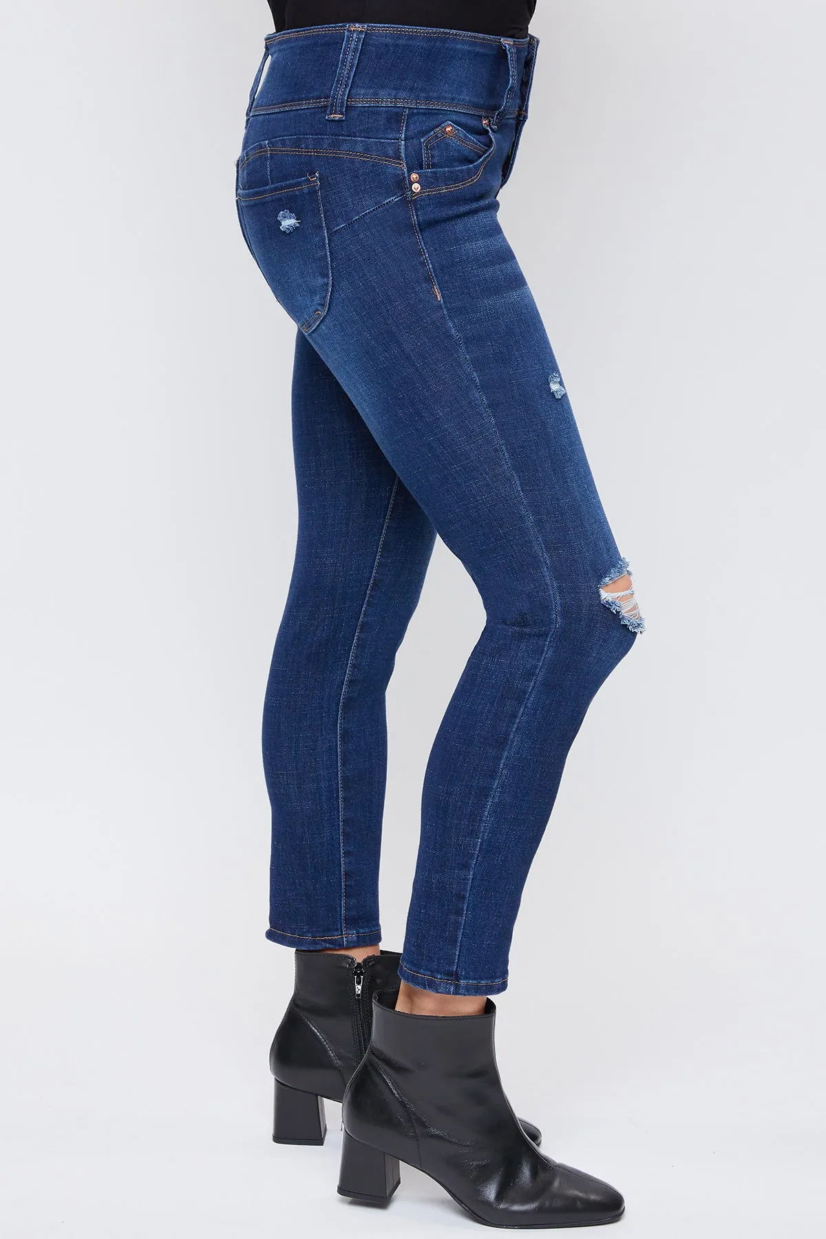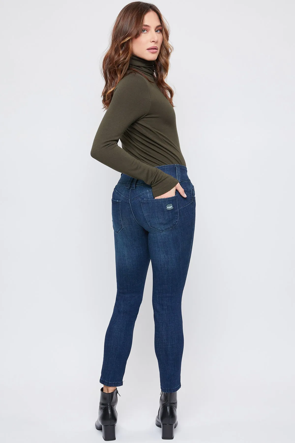 Your love for skinny jeans just got greater with our Women’s Petite WannaBettaButt Mid-Rise 3-Button Lycra Jean Made with Recycled Fibers. Our signature skinny jeans updated with vintage-like characteristics, such as an exposed button fly and distressing to give a slightly rigid look. Made with lightweight and stretchy, yet durable recycled micro fibers, our WannaBettaButt recycled fabric denim collection provides you with the right amount of comfort and stretch for your jeans. Style these with a form-fitting tucked in top, or front tuck a loose blouse to show off the trendy button fly detailing.
