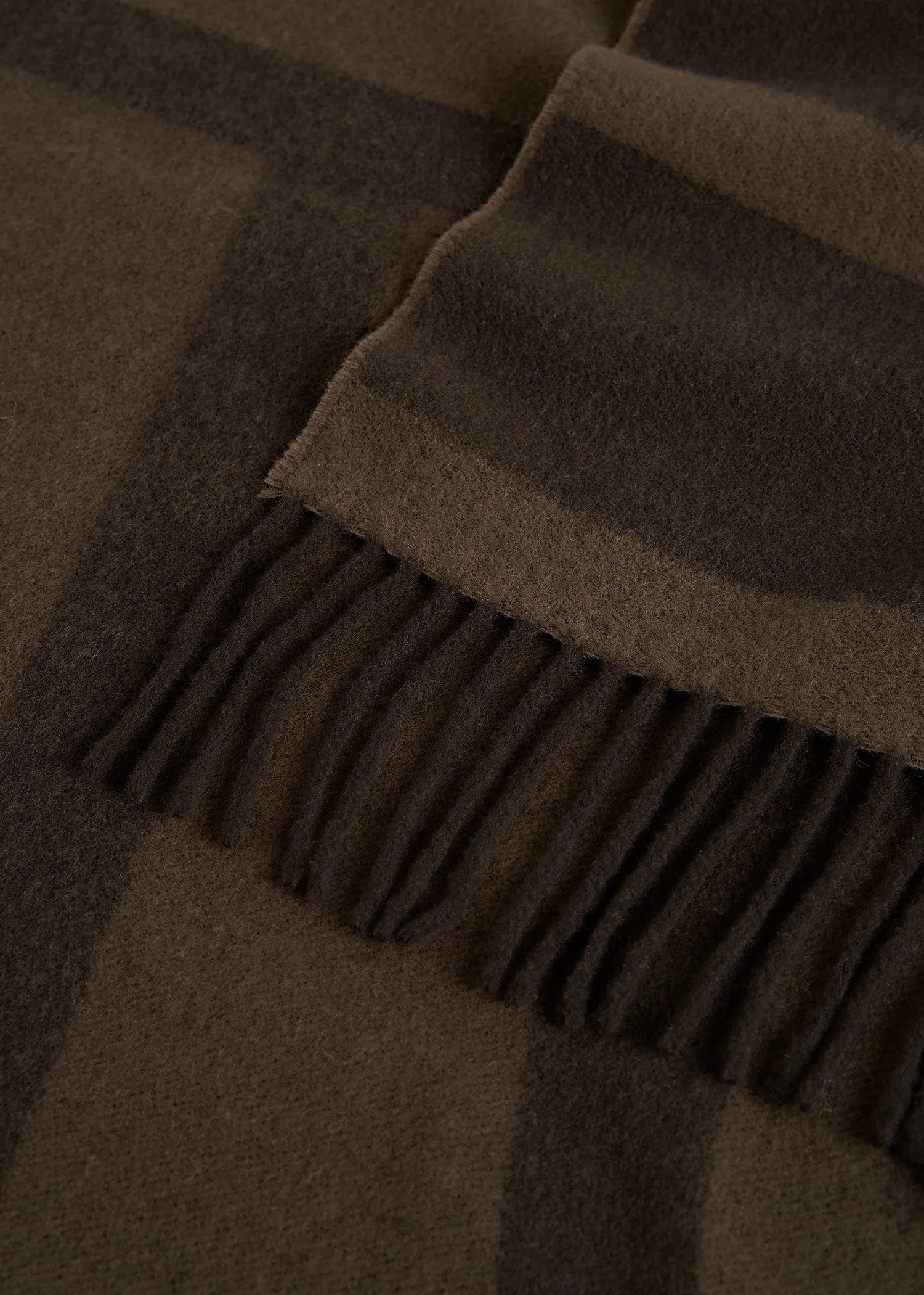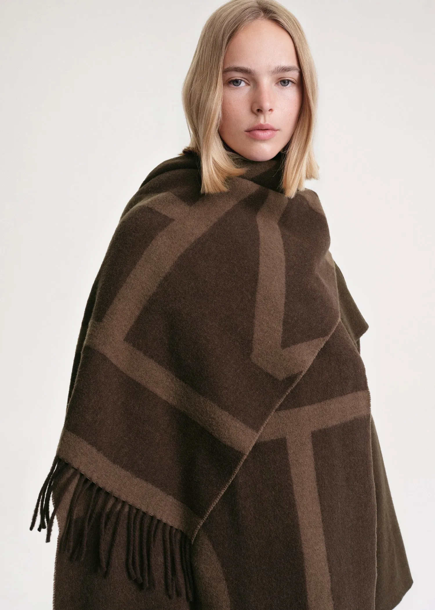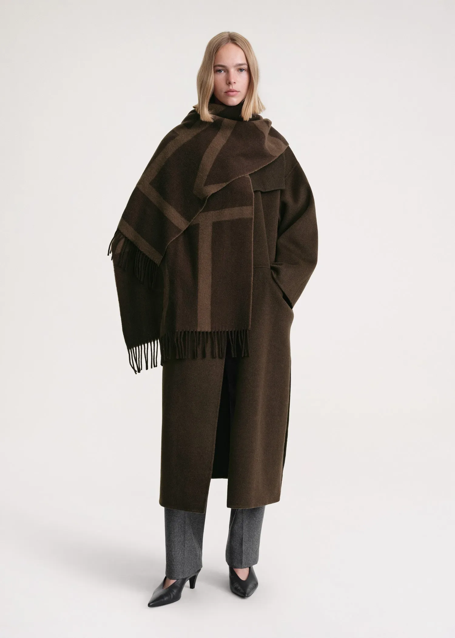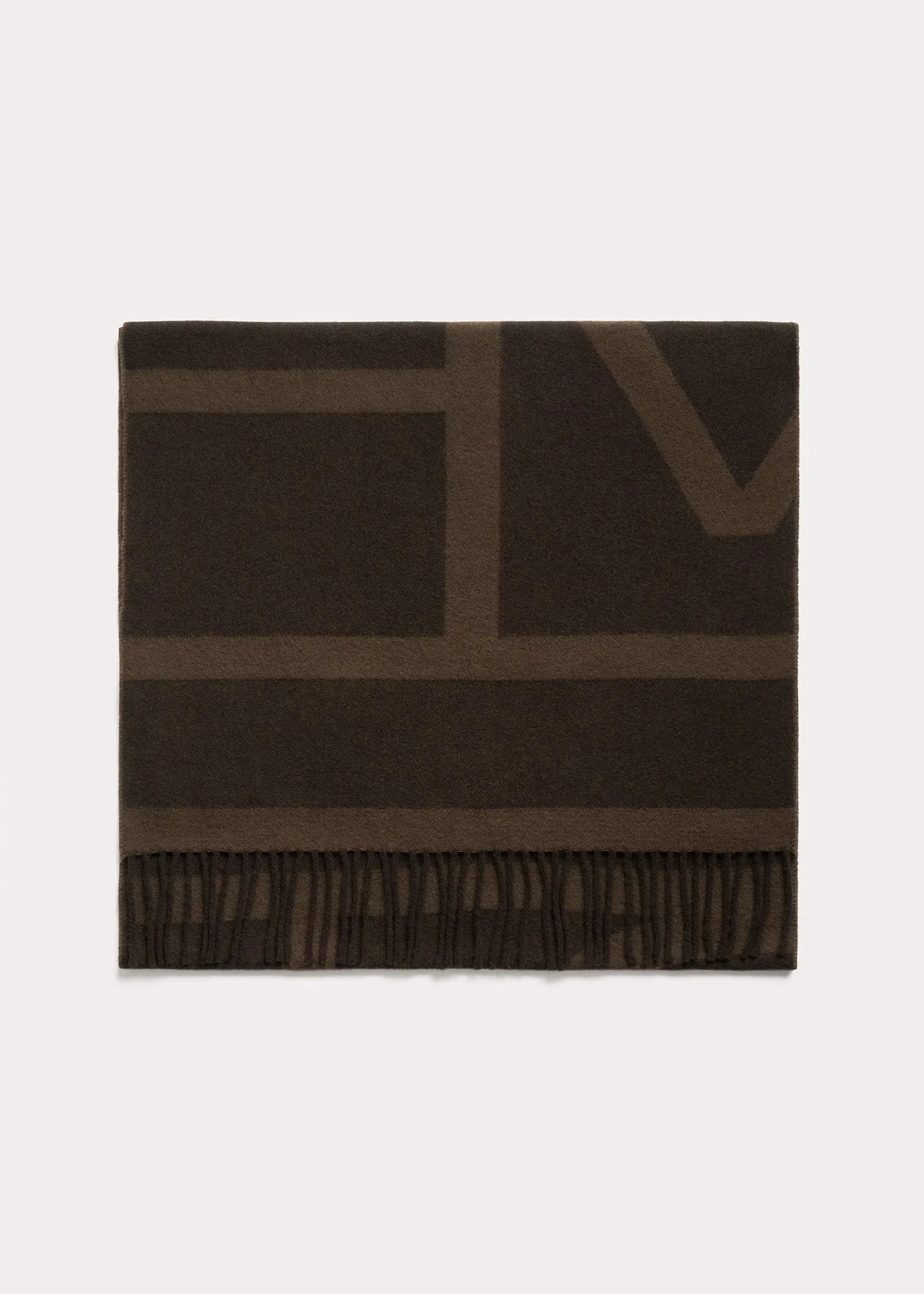 TOTEME scarf featuring a tonal monogram jacquard with a negative reverse and fringed edges. It's woven in Italy from wool certified by the Responsible Wool Standard and measures 220x50cm. Wear it throughout winter over your favorite coat or jacket.