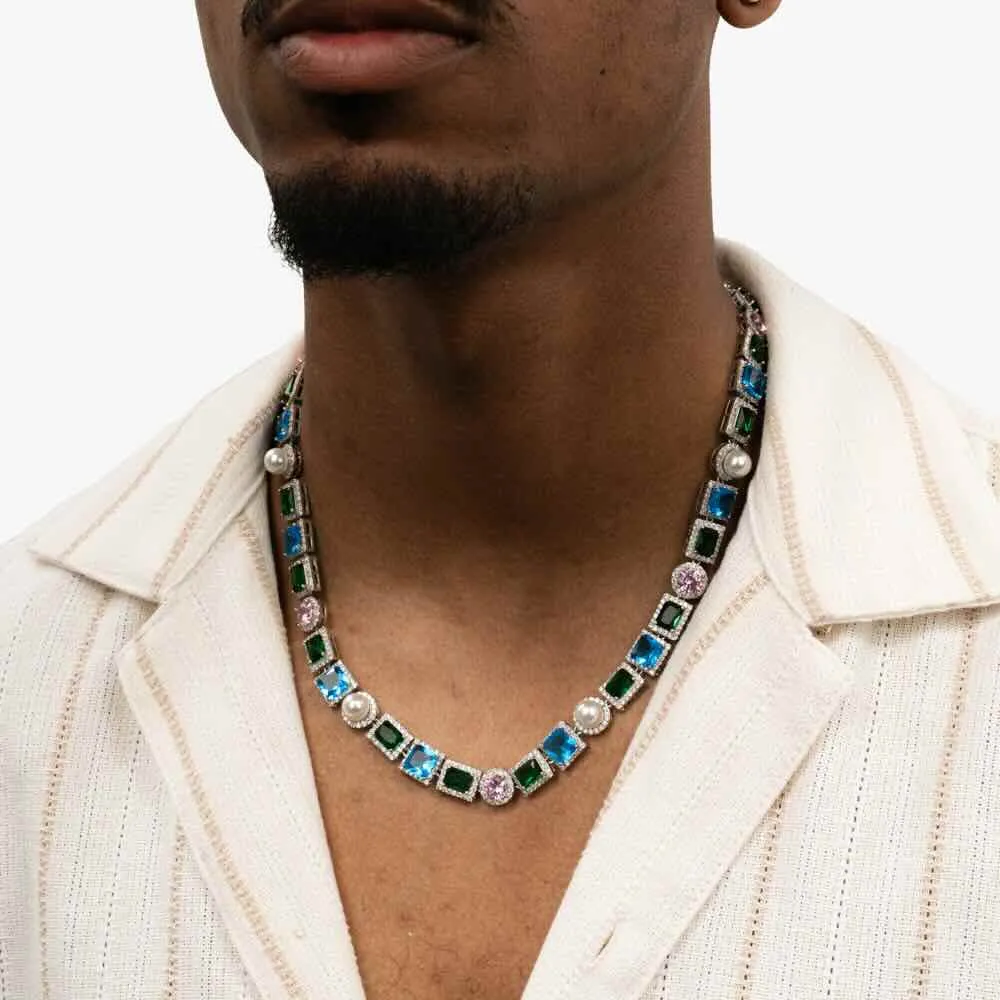This multi gemstone chain is iced out with round, colorless (D-Color), VVS moissanite flawless diamonds, placed in a prong diamond setting. All of the diamonds on this necklace is guaranteed to pass the diamond tester.