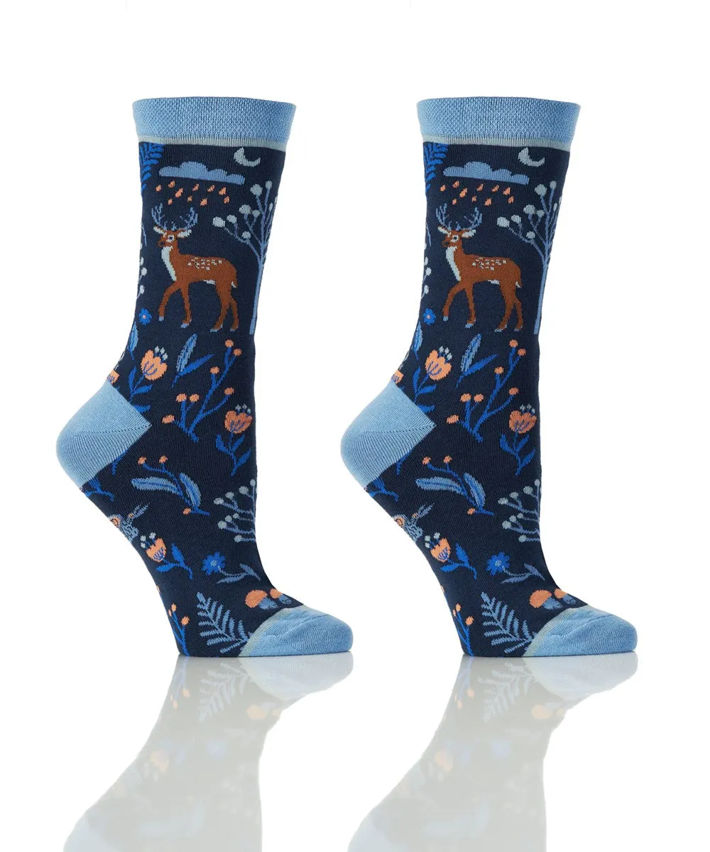 Women's crew sock with night forest and reindeer print. Compact Cotton and anti-microbial. Reinforced deep pocket heel and toe. Fits Women's Shoe Size 6-10. Cotton.