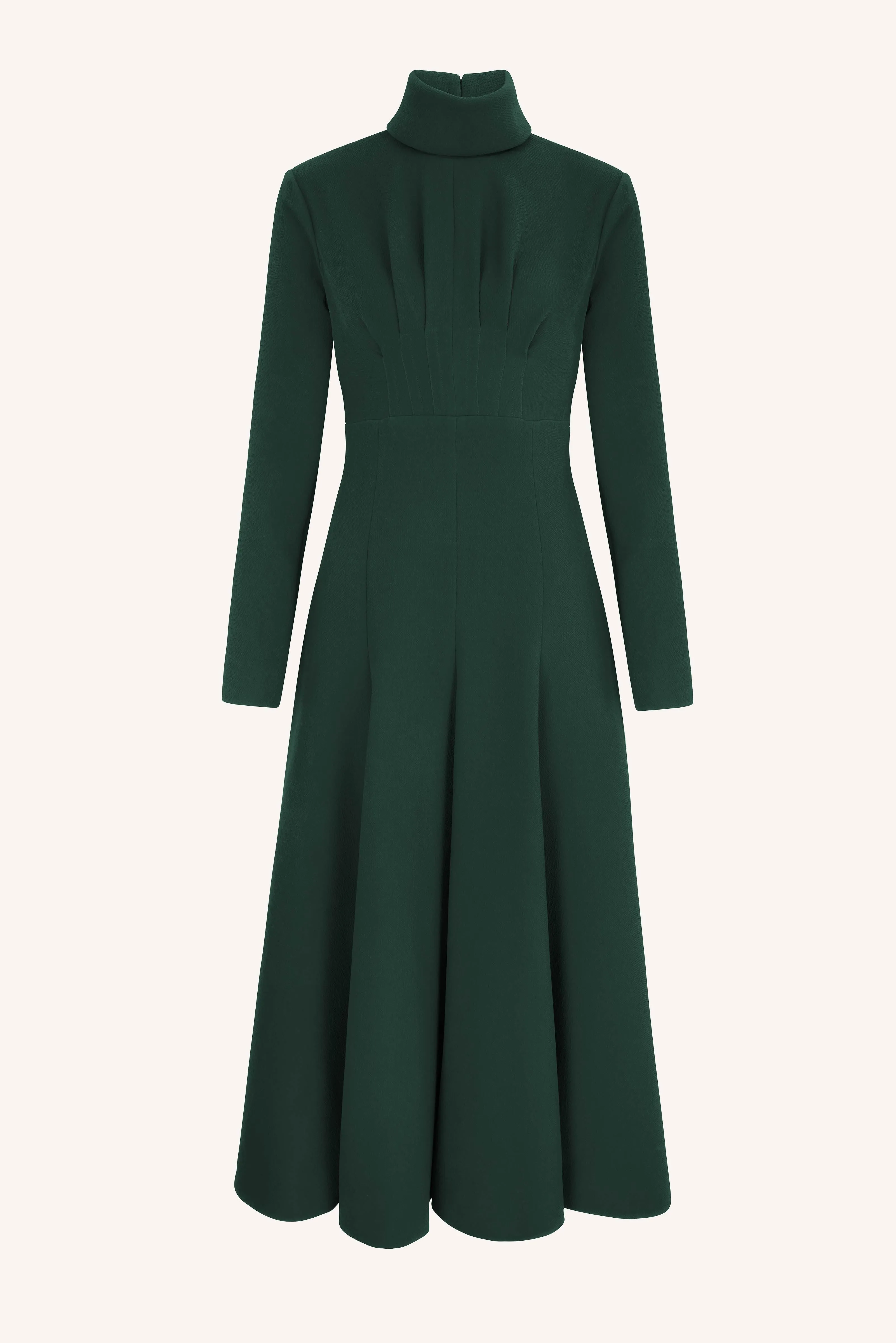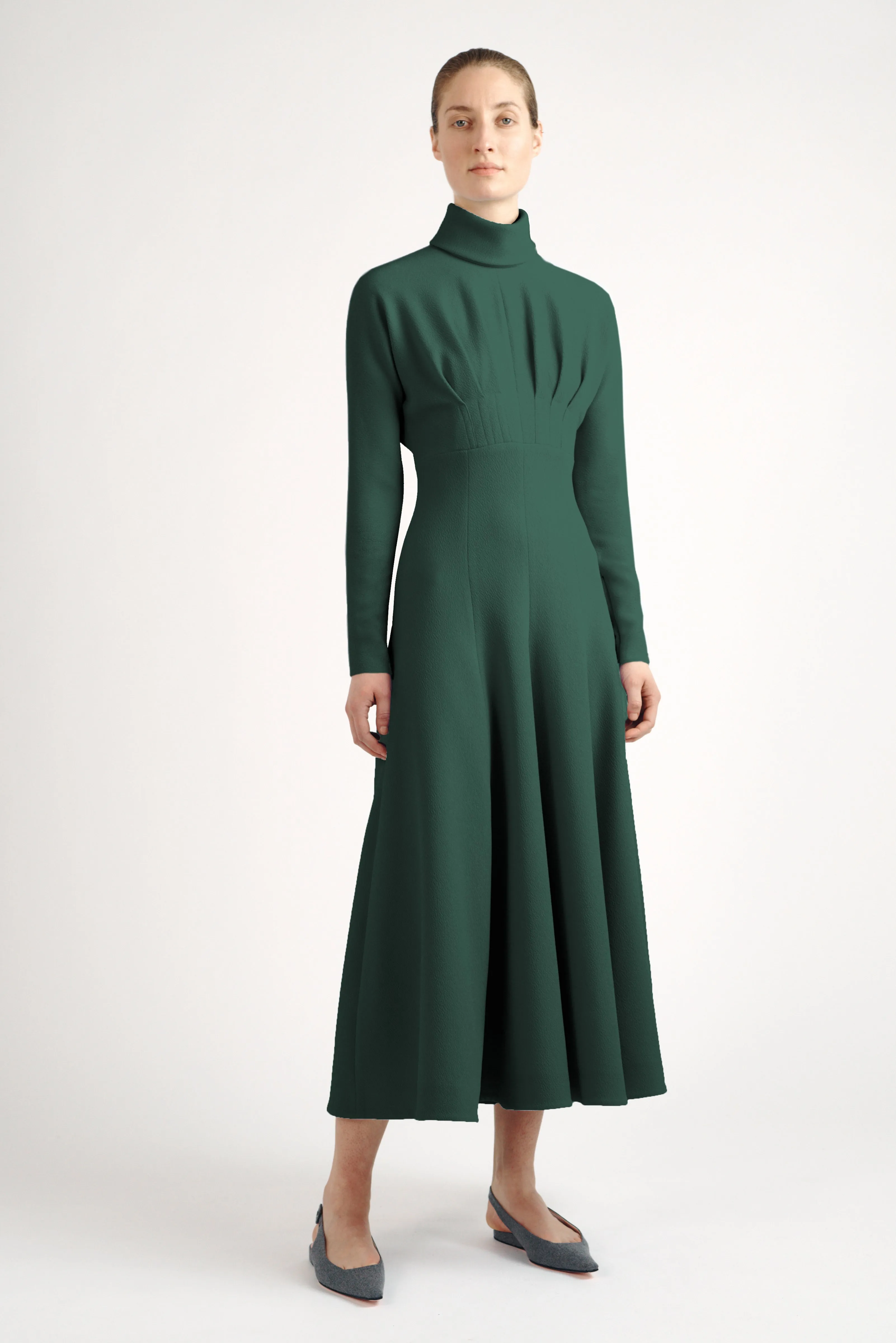 Crafted from an elegant forest green hue, the softly structured cut of the Oakley dress encapsulates the Emilia Wickstead feminine sensibility. The high-neckline of this dress is accented with considered pintuck detailing through the bodice. Constructed for a close fit at the waist, this dress features godet detail through the skirt adding volume and movement to this otherwise fitted style.