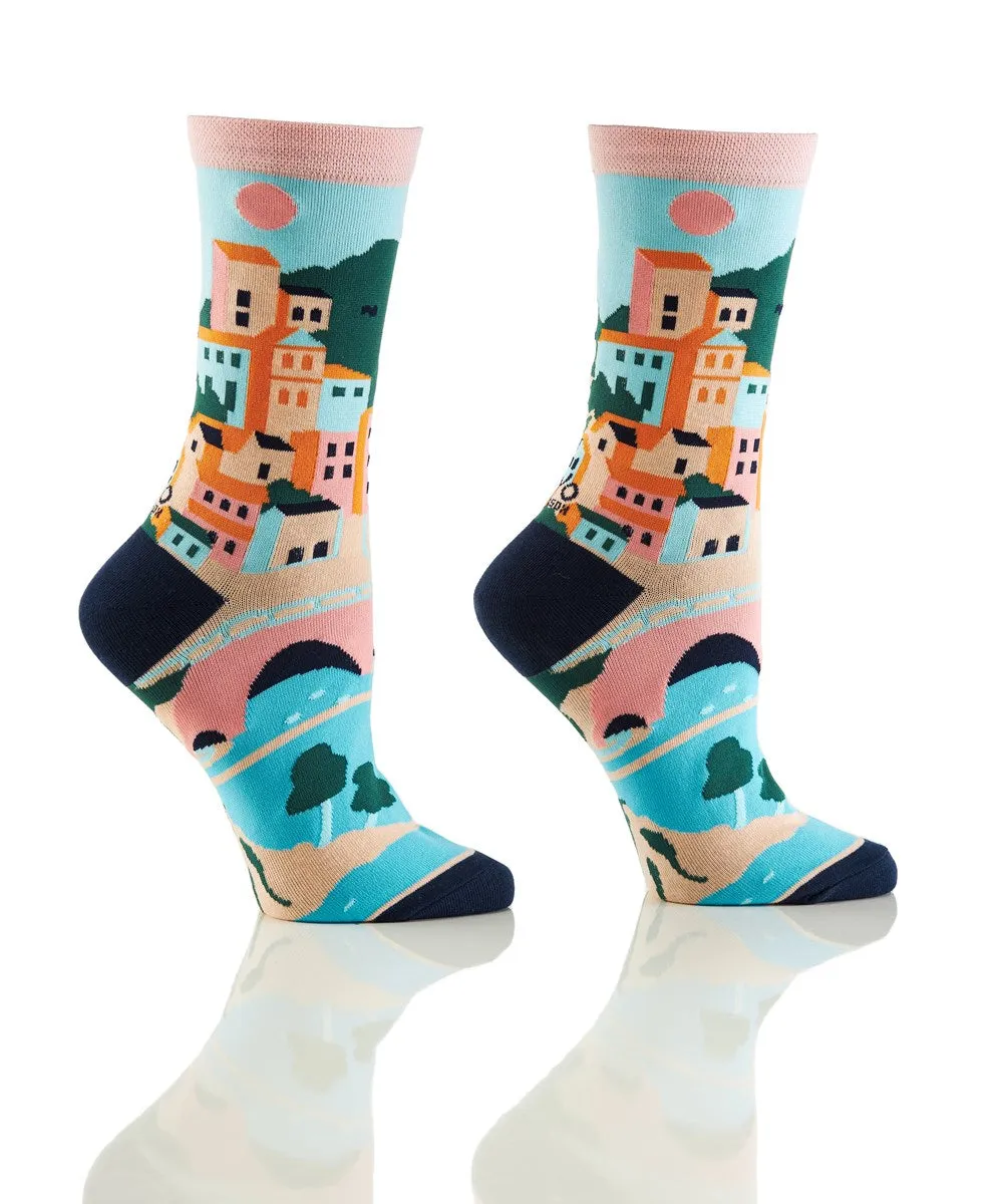 Women's dress socks with oceanside cityscape print. Perfect for those who dream to constantly be by the ocean on vacation.