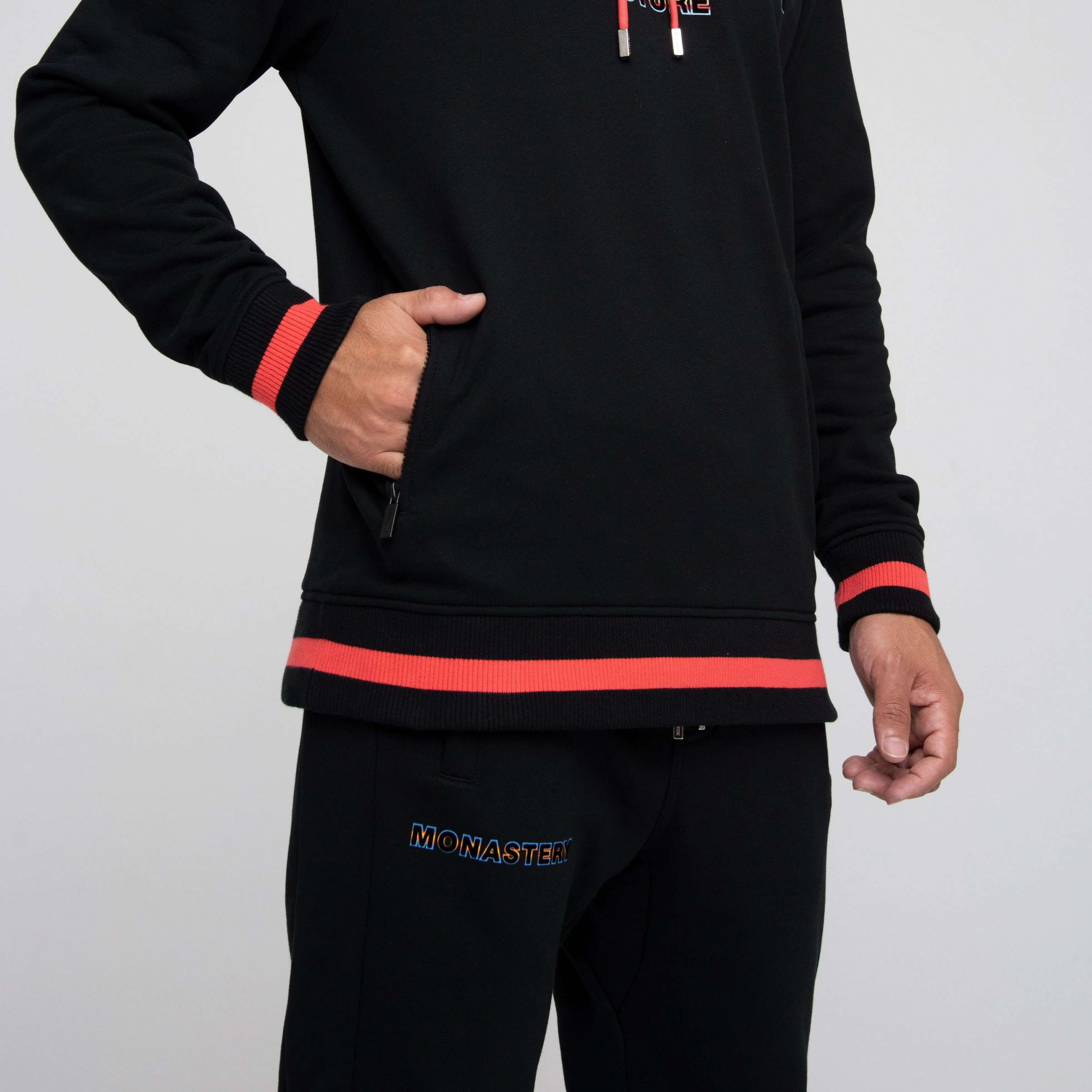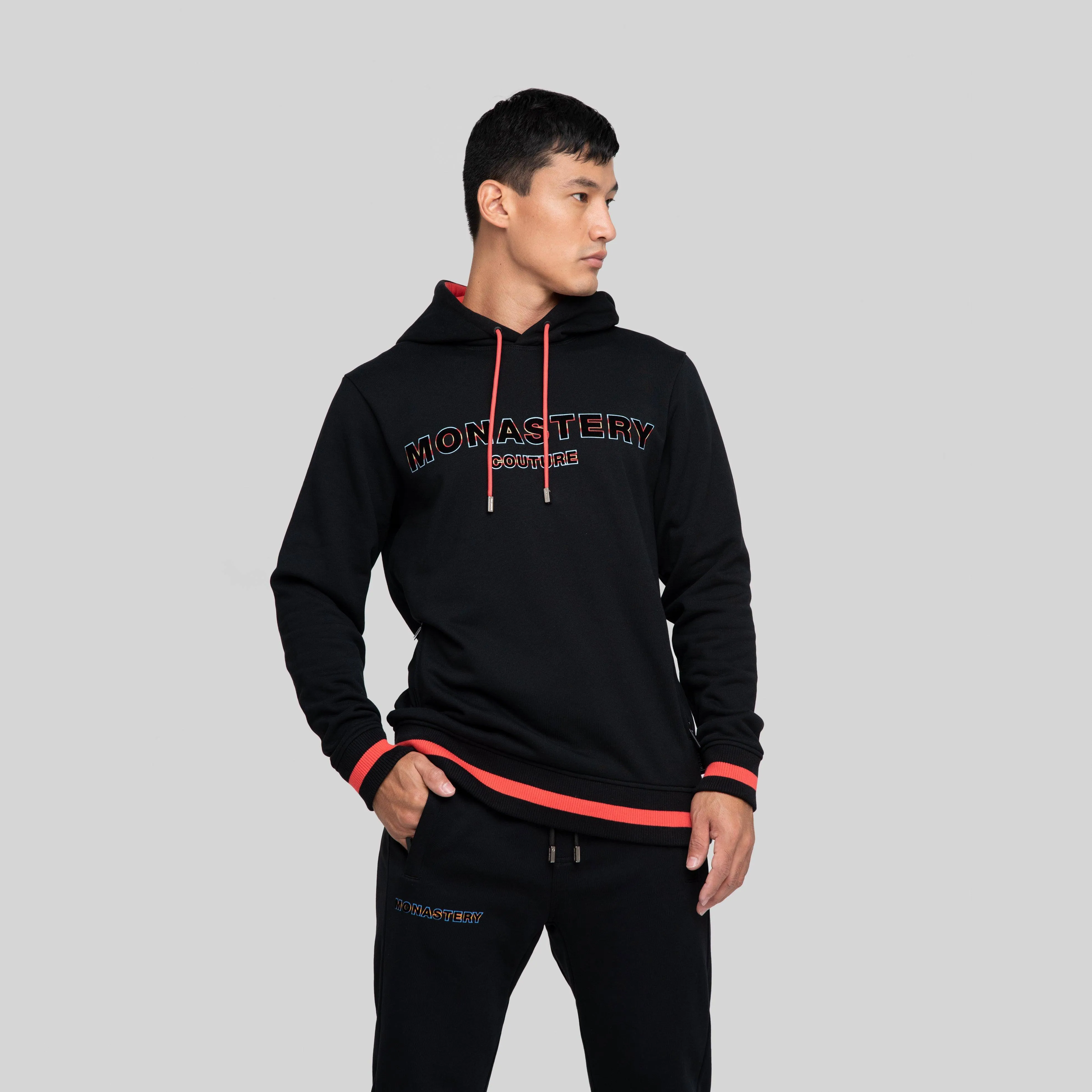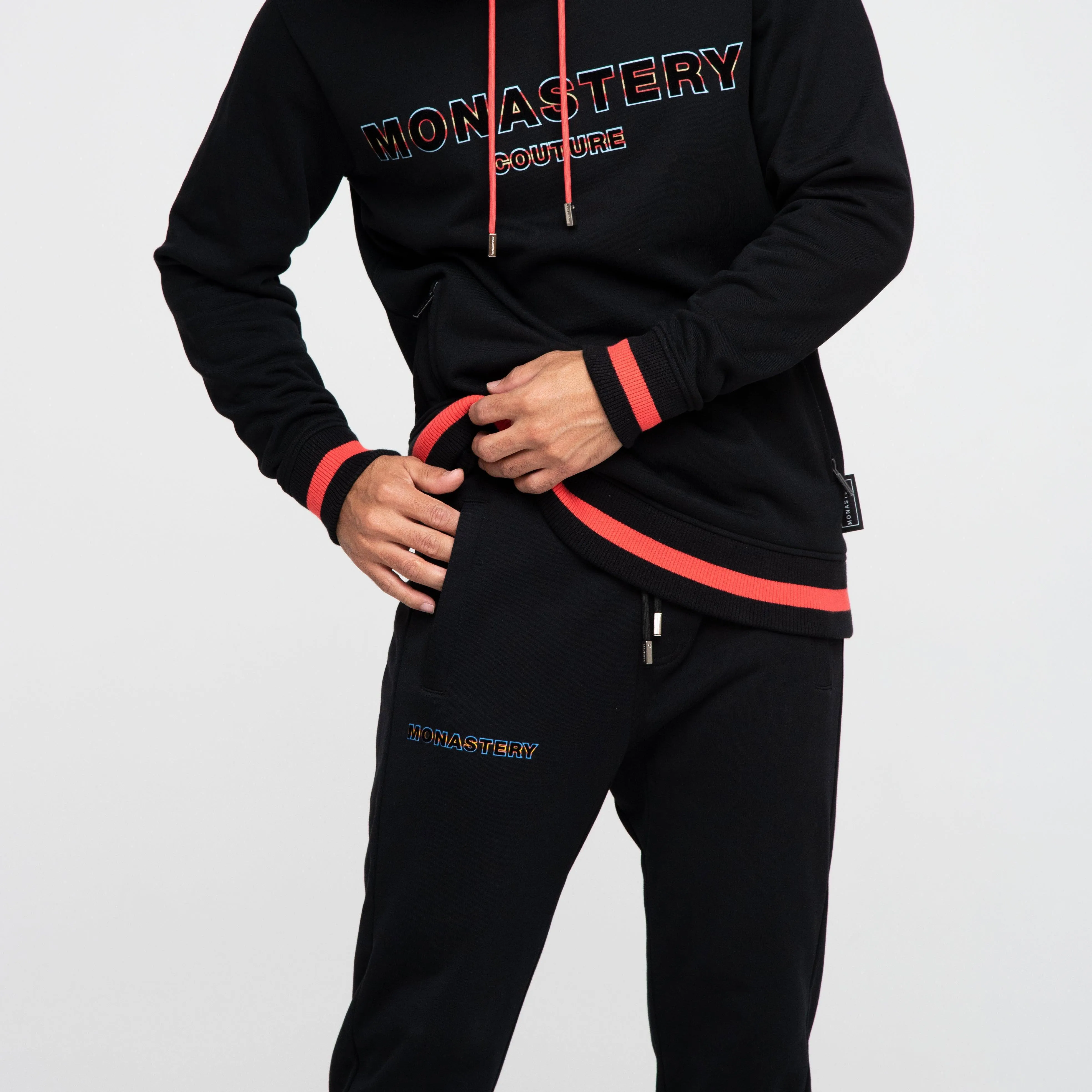 Our Jogger Phoenix, presents the text "Monastery Couture" stamped on flock. In addition, it features cord with counterbitter metal struts, and a straight boot with tobilera in rib for a distinctive touch. The textile base is 100% composed of Peruvian cotton, ensuring an exceptional quality and an unparalleled sense of comfort. This Jogger is made up into a regular silhouette, designed to enhance the male figure