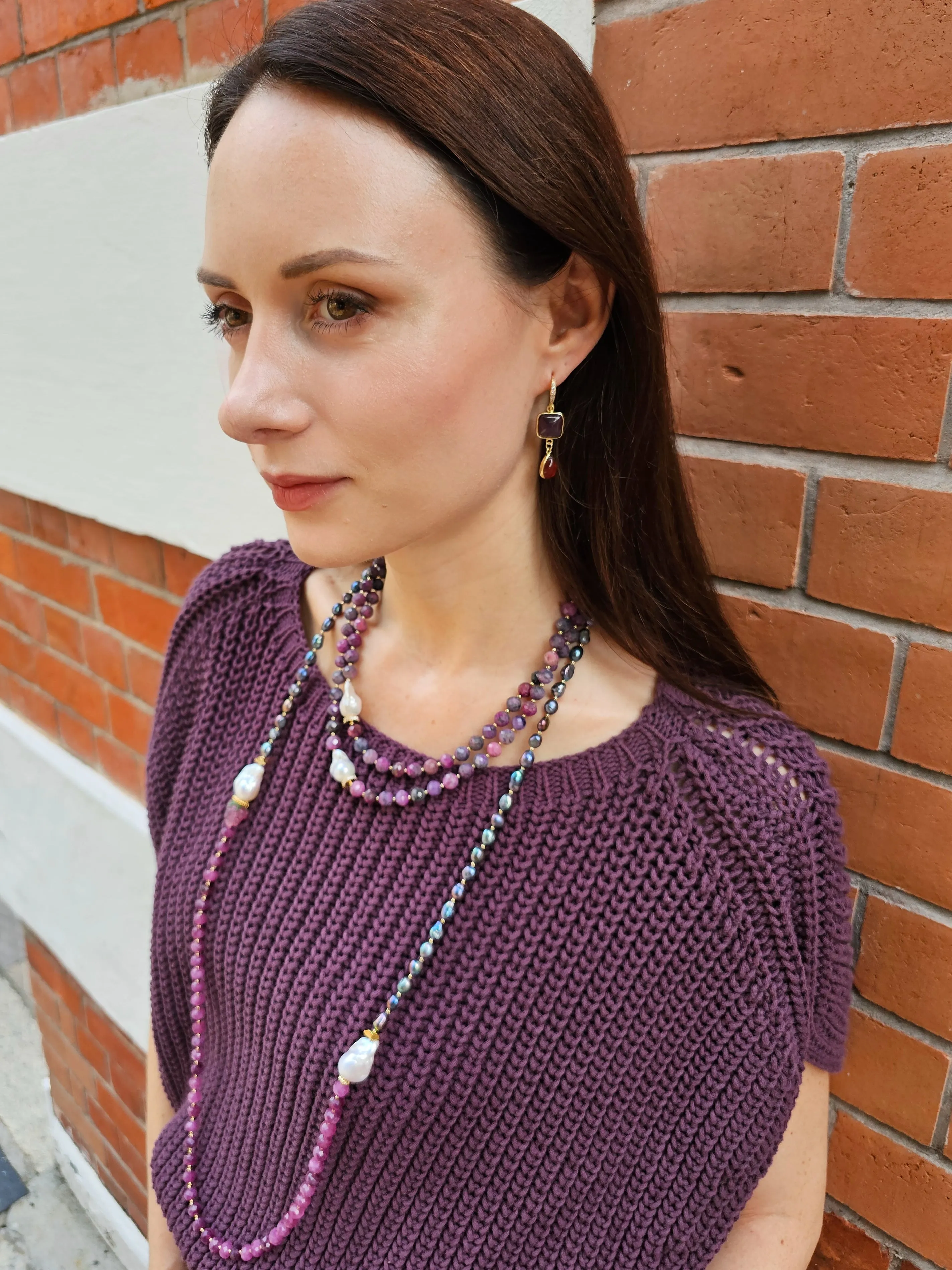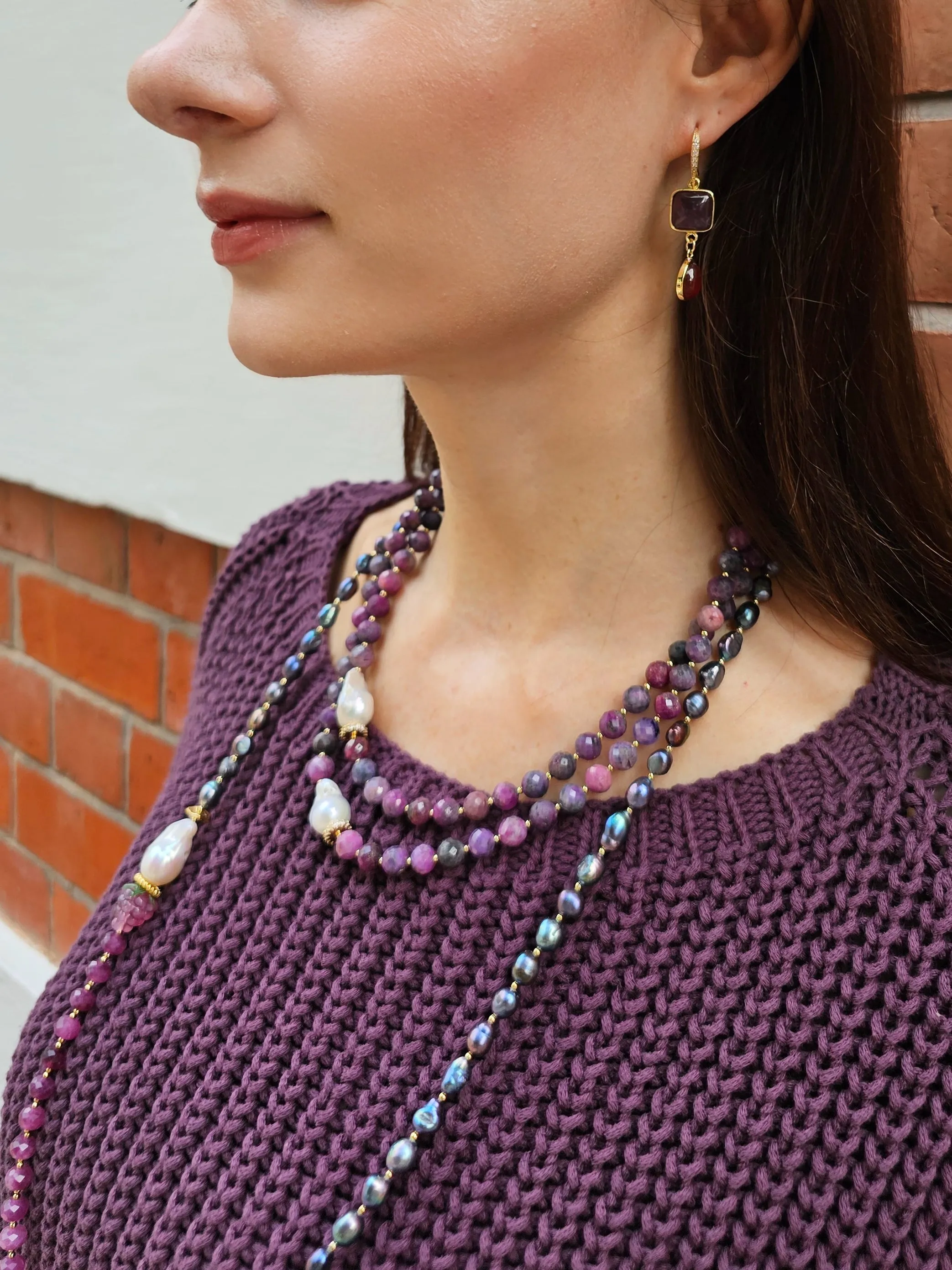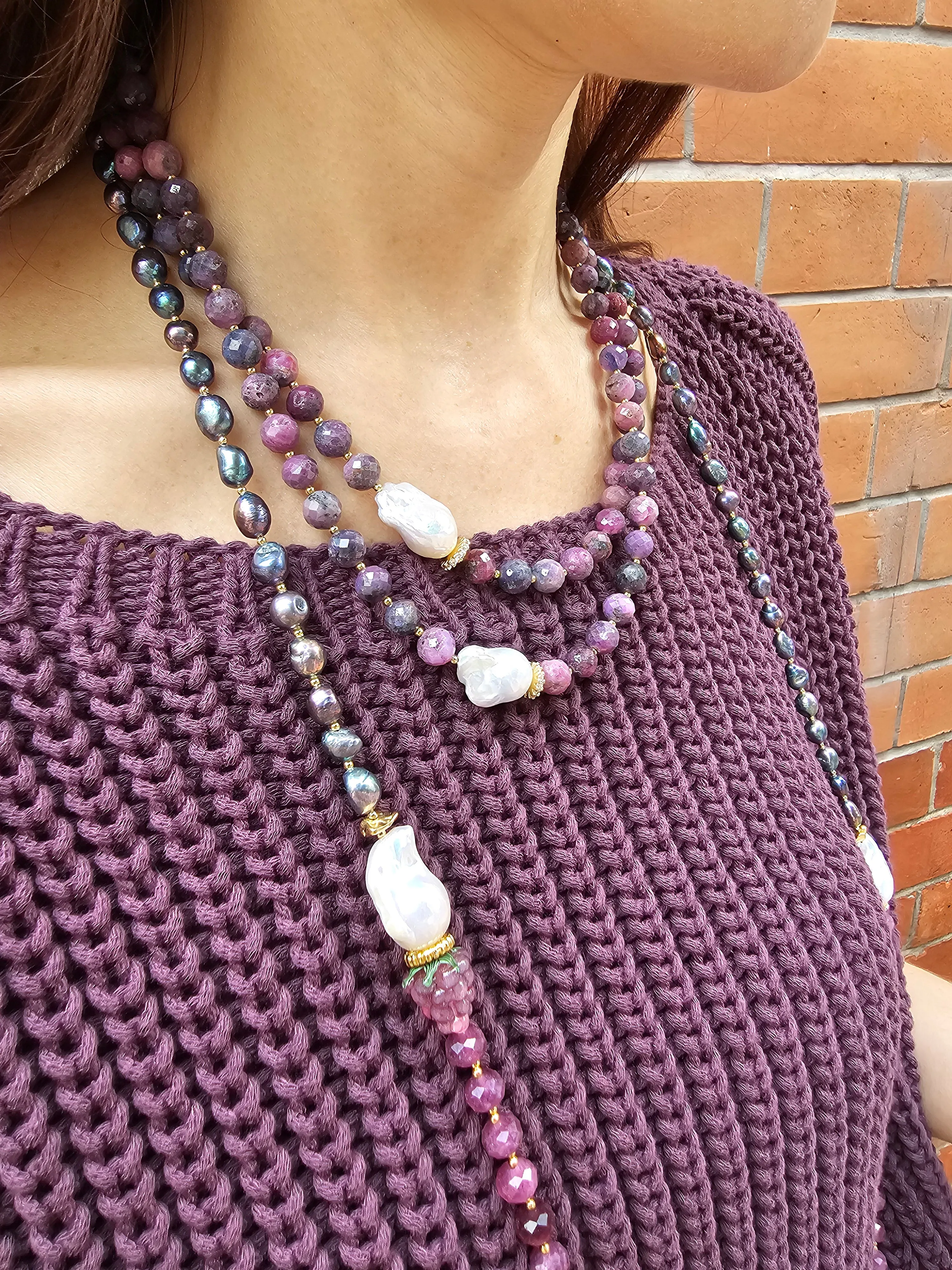 This necklace is a true embodiment of elegance and sophistication. This exquisite piece features rich purple tune rubies, the birthstone for July, known for their association with passion and vitality. The unique shapes of Baroque pearls add a captivating contrast, showcasing intricate details that elevate the overall design. The double-layer structure adds depth and dimension, making it the perfect statement piece for any occasion.