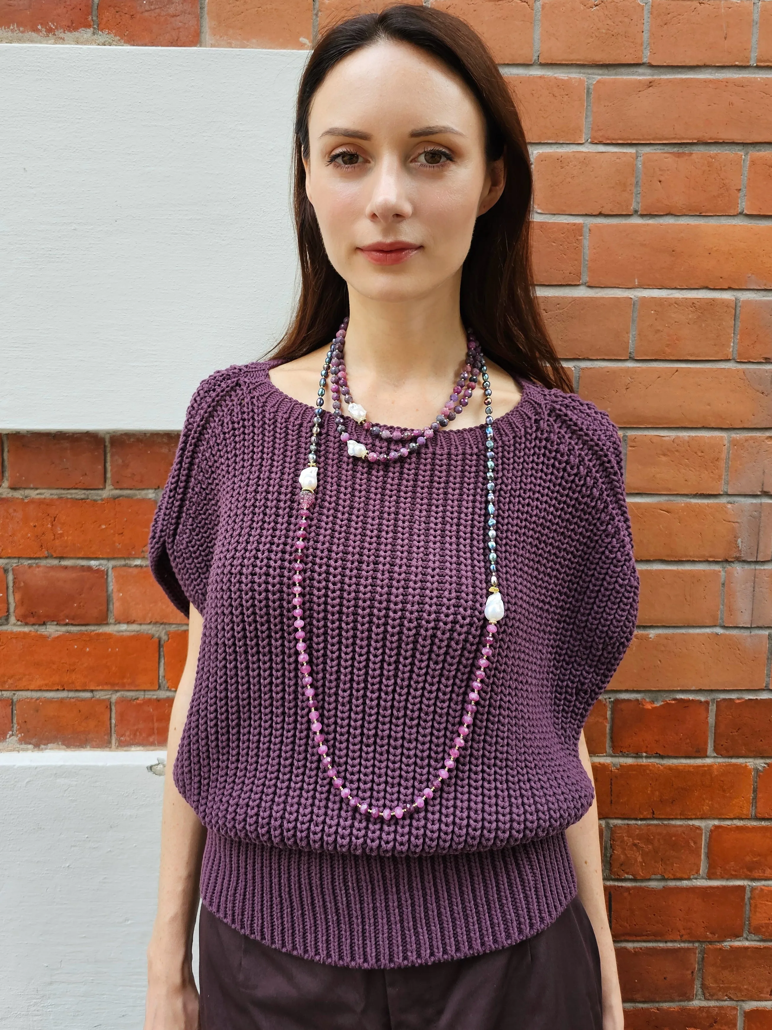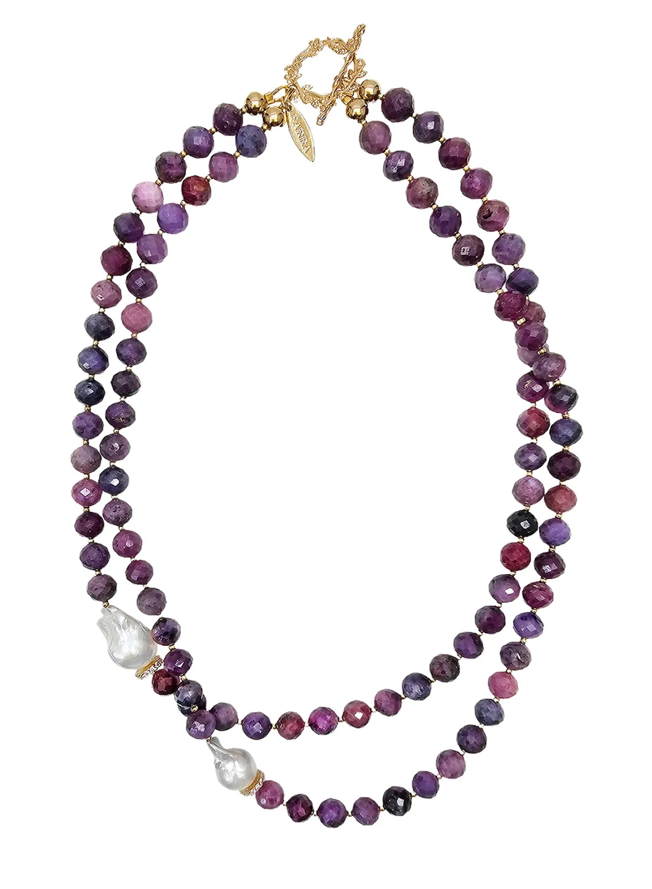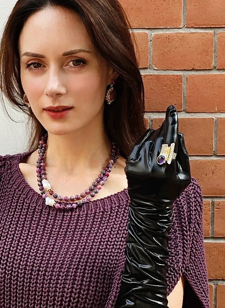 This necklace is a true embodiment of elegance and sophistication. This exquisite piece features rich purple tune rubies, the birthstone for July, known for their association with passion and vitality. The unique shapes of Baroque pearls add a captivating contrast, showcasing intricate details that elevate the overall design. The double-layer structure adds depth and dimension, making it the perfect statement piece for any occasion.