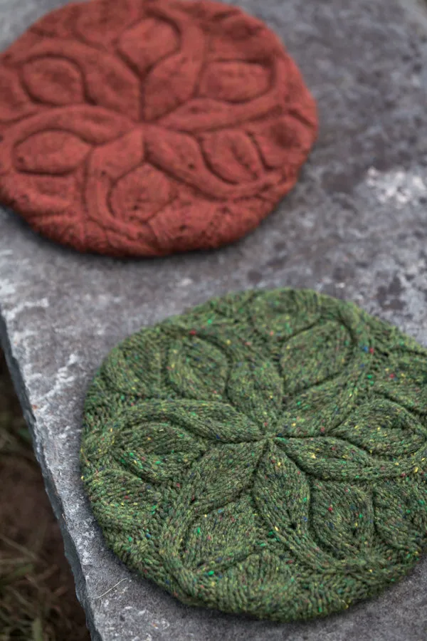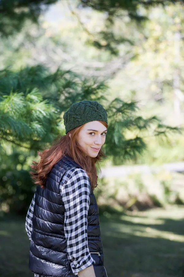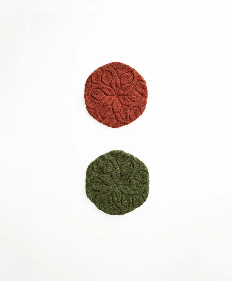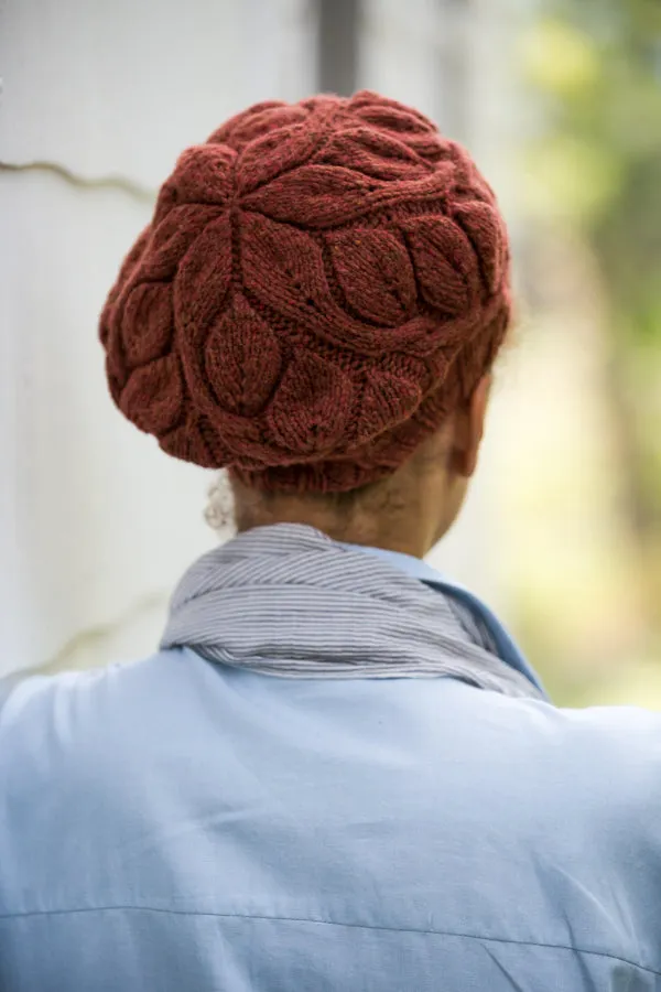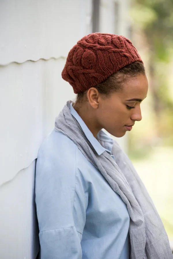 A garland of embossed foliage makes a pretty beret to wear hiking in the hills or returning to the city. In the capable hands of cable whisperer Irina Dmitrieva, botanical inspiration translates to a rhythmic, dancing, distinctive motif. Worked from a tubular cast-on for a durable and professional edge, Rambler’s ribbed brim quickly begins to twist into cabled vines that sprout leaves and sweep up to a star-shaped crown. The elasticity of the ribs will accommodate nearly any adult head. Knit from a single skein of Shelter, Rambler is ideal for holiday gifts. Choose a warm autumnal hue, a leafy green, or pop of bright color that will make you smile all winter long.