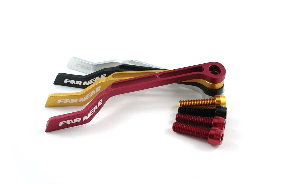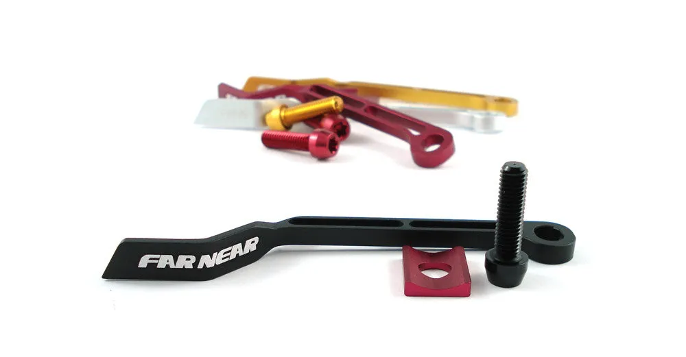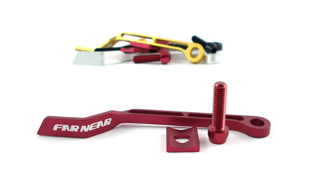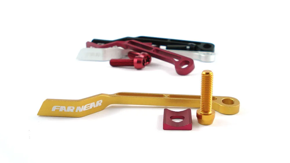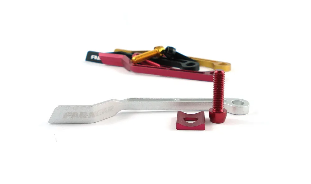 The chain deflector mounts on the outside of the frame's braze-on tab and in-between the supplied bolt and concave washer. It is gracefully angled so it will catch the chain from the highest point and slide it back to the inner ring. Set the deflector up close to the inner ring and then there is no chance of the chain heading off the track. The bolt is a T25. The Silver coloured deflector is supplied with a red anodized bolt while all the others use colour coded bolts.