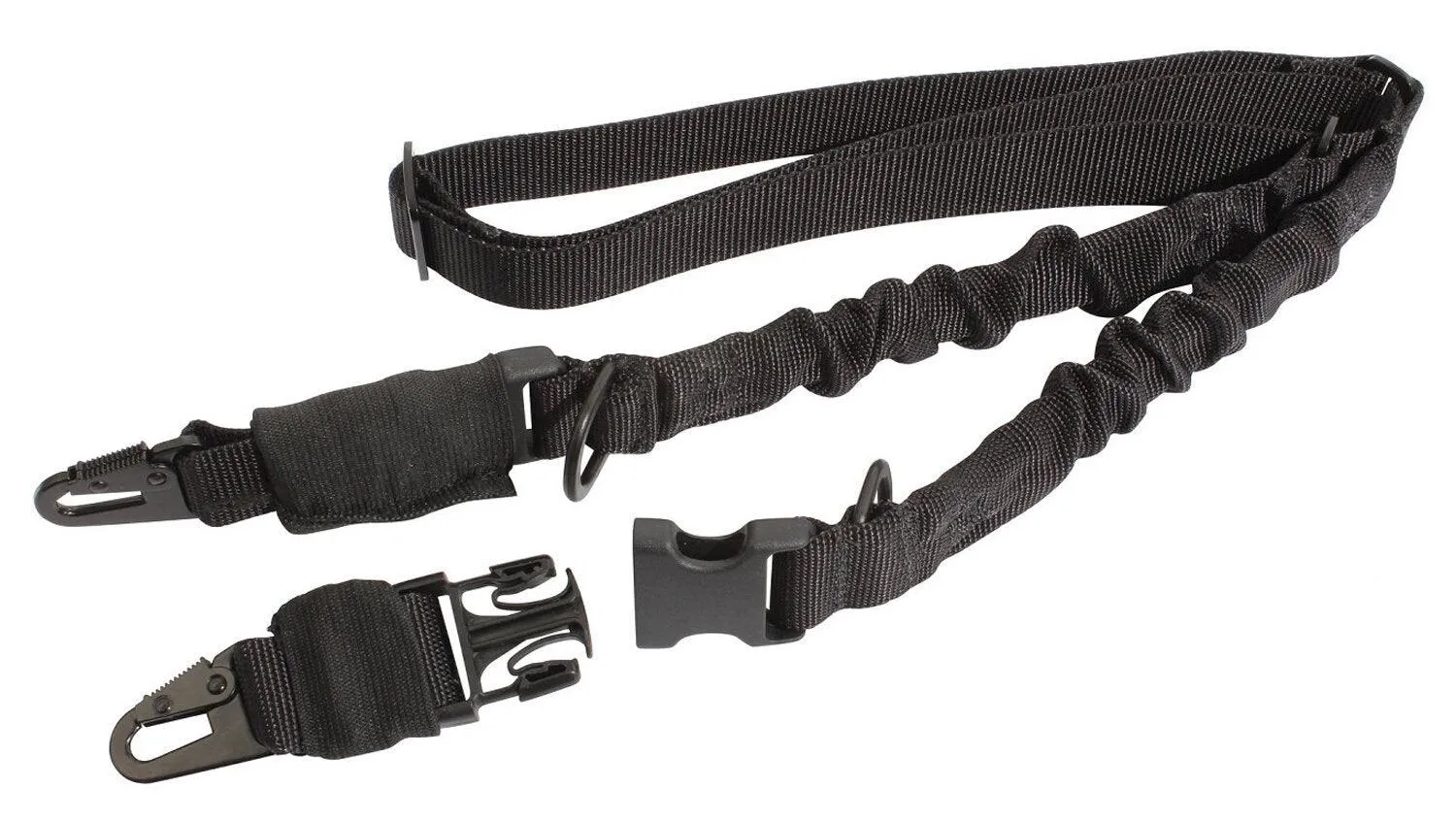 Enhance your tactical gear collection with Rothco’s 2-Point Tactical Sling. Constructed with nylon webbing, this tactical sling features fully adjustable shoulder straps and dual bungee cords to help reduce bouncing and enhance retention for the user. Easily attach or remove your 2-point tactical sling from your firearm with the quick release buckle. The 2-point firearm sling can easily be converted into a single point sling with the metal spring clip. This tactical sling is perfect for shooters, airsofters, and/or paintballers looking for an optimal way to carry their rifle.