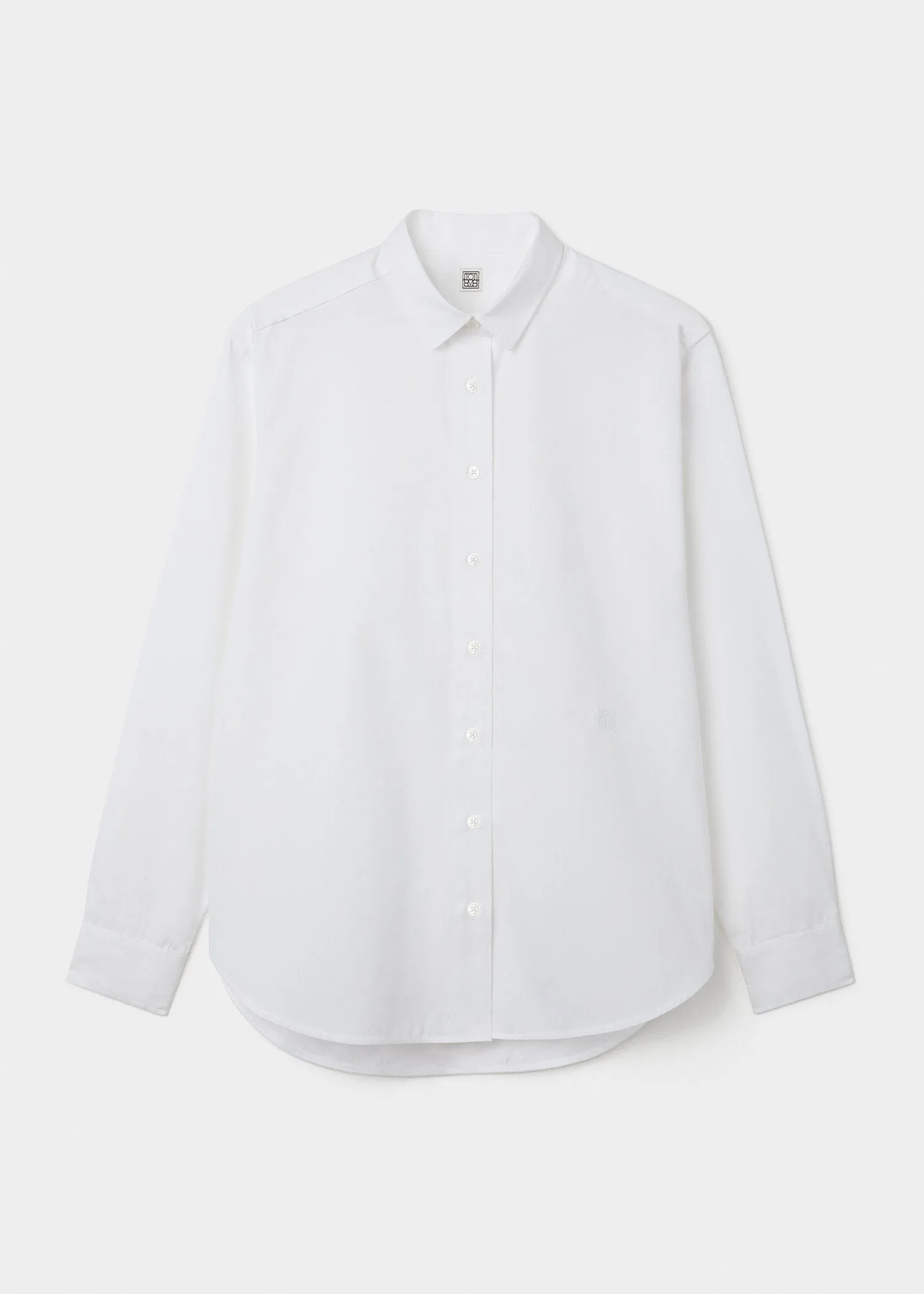 Signature TOTEME shirt constructed with a dipped back hem, resulting in a chic A-line profile. It's made in Portugal from crisp organic-cotton poplin and shaped to a wide, slightly oversized silhouette with a point collar, mother-of-pearl buttons at the placket and cuffs, and an embroidered monogram at the front. Tuck a scarf inside the open neckline to add an elegant touch.