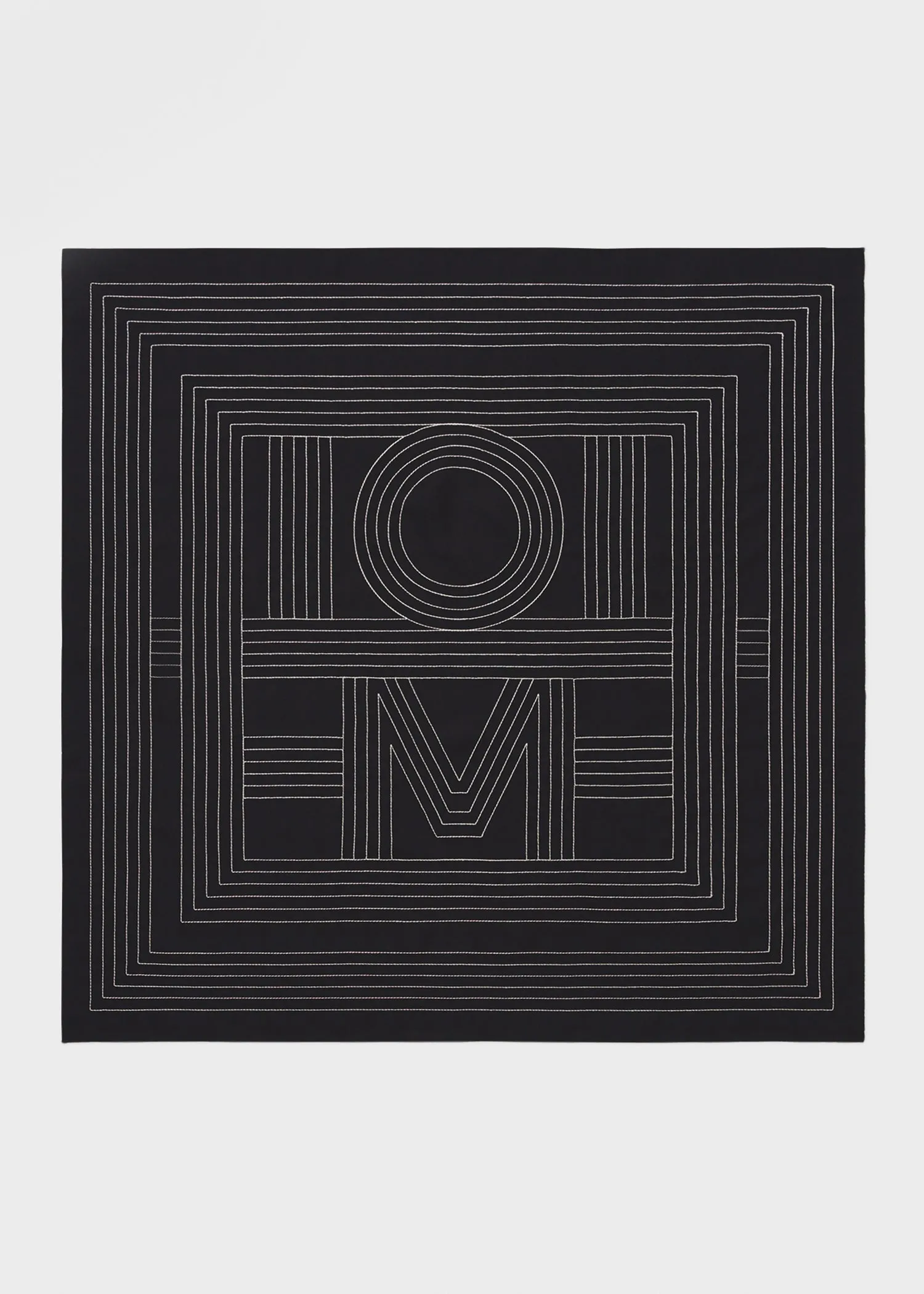 Large TOTEME silk scarf measuring 80x80cm and embroidered with a contrasting crème monogram. Wear it around your neck or over your shoulders.