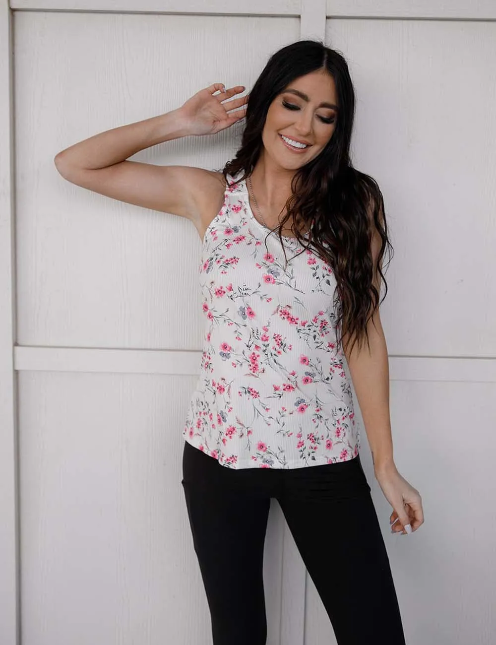Start your perfect vacation with our favorite floral and ribbed tank top!