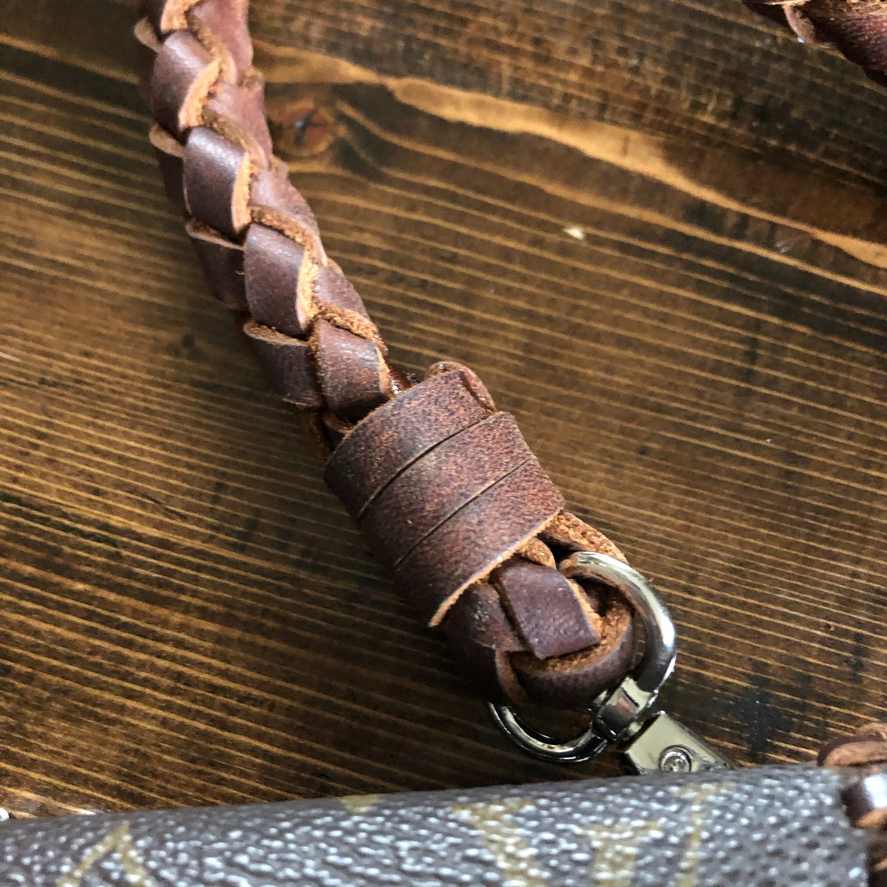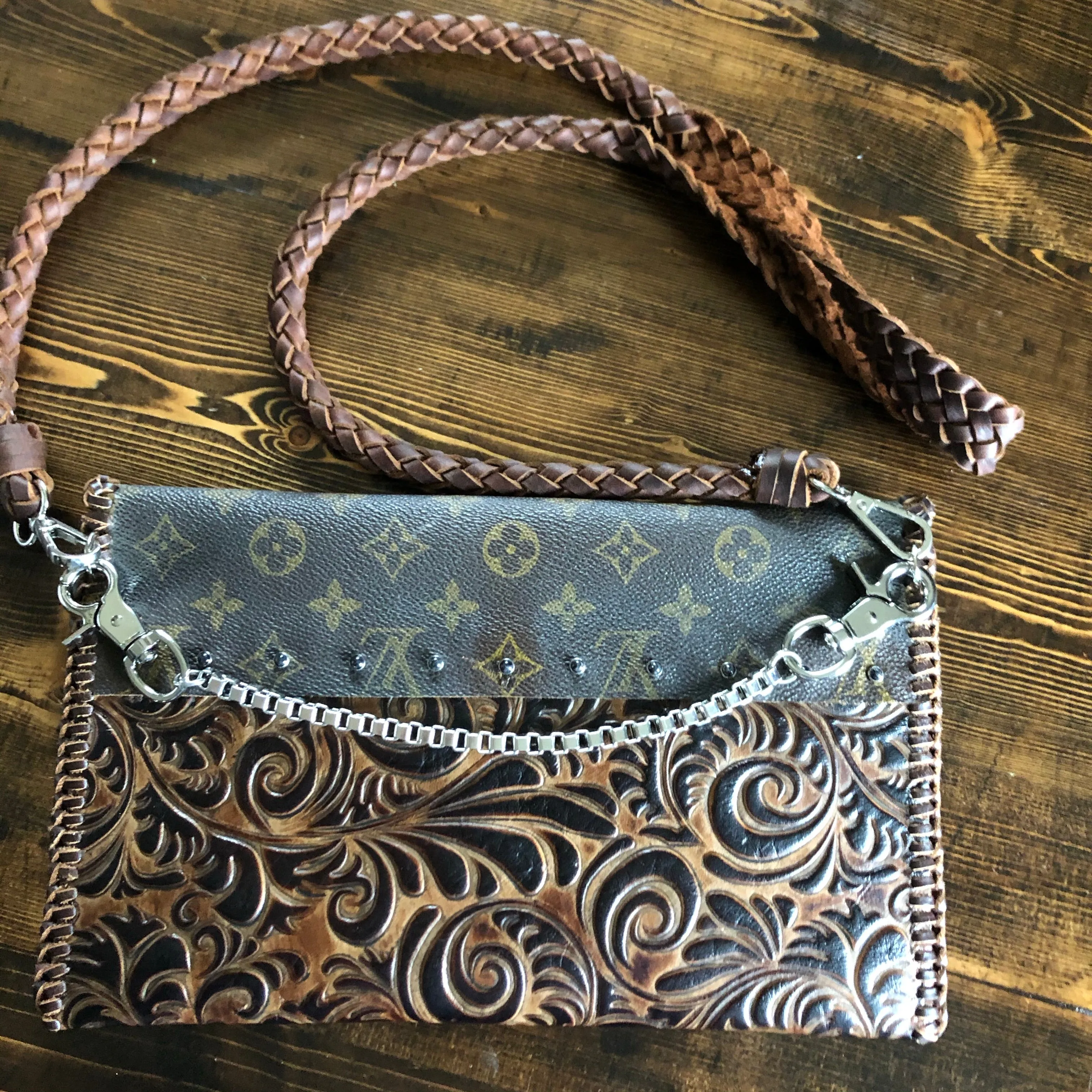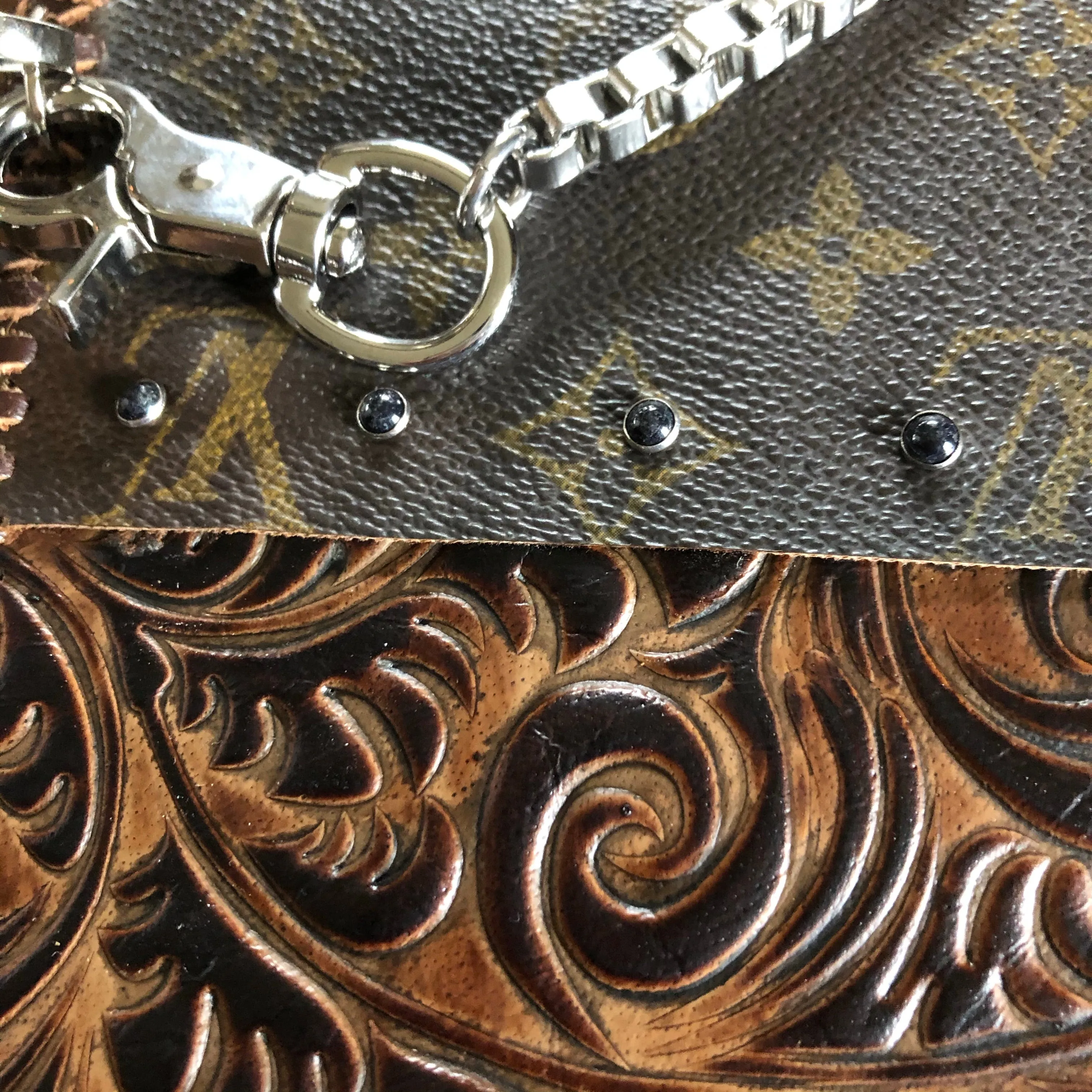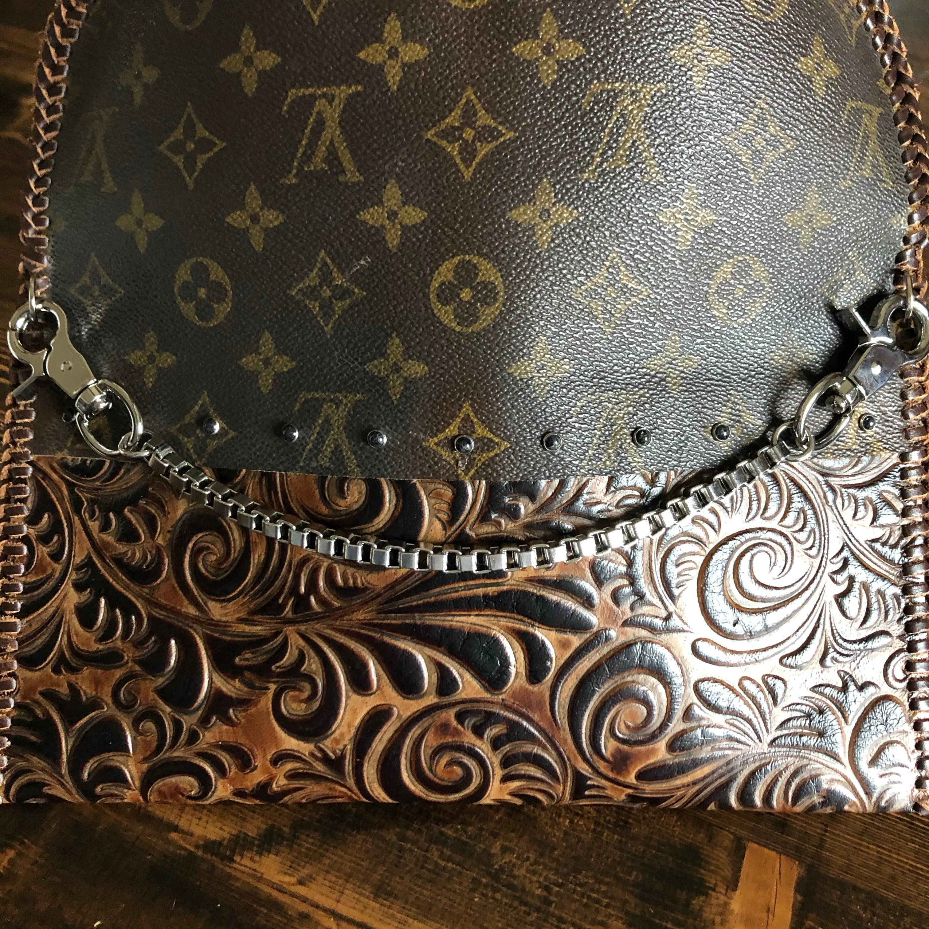 An authentic Louis Vuitton Monogram bag was used along with a gorgeous brown/black embossed leather. The two join together in the back with beautiful black stone rivets!