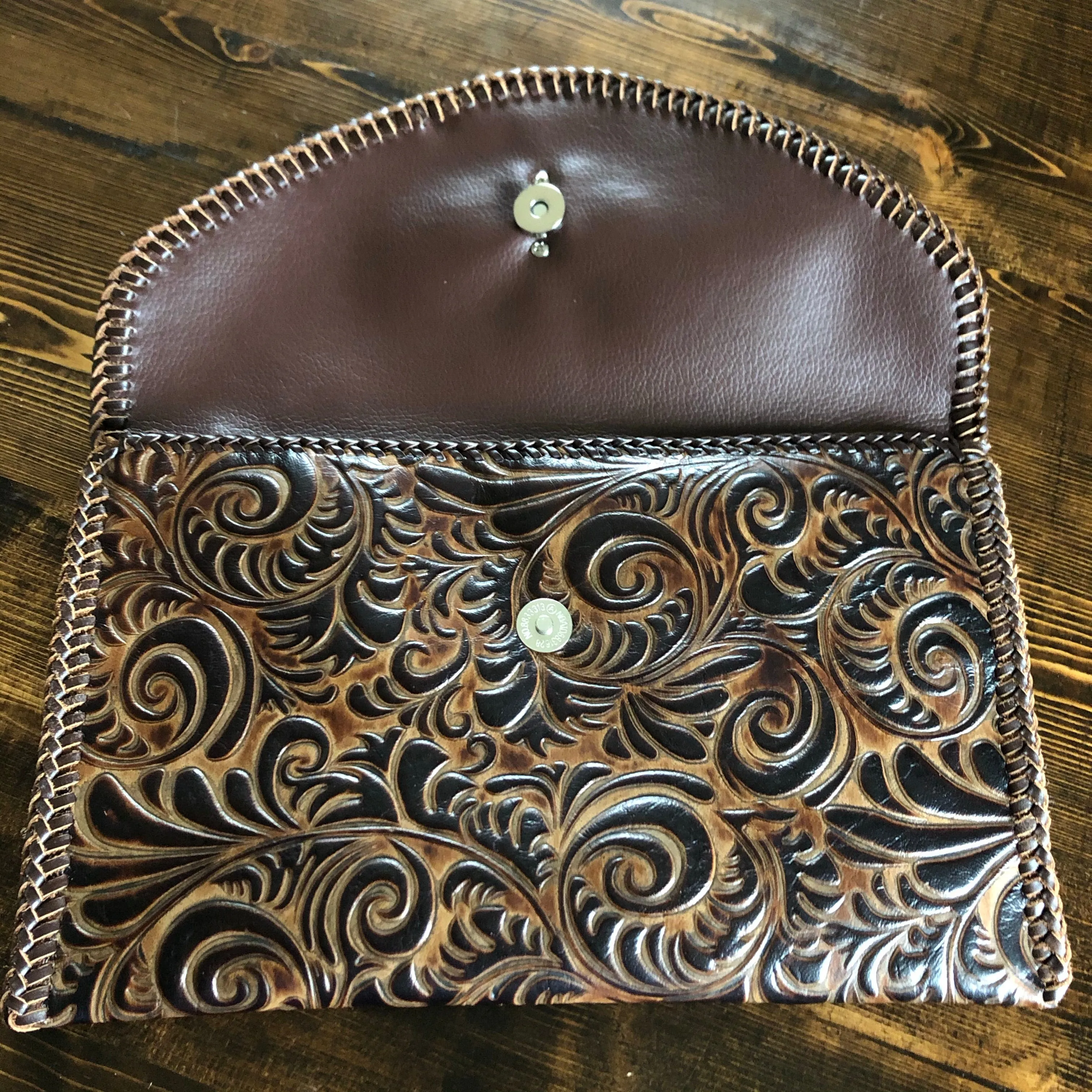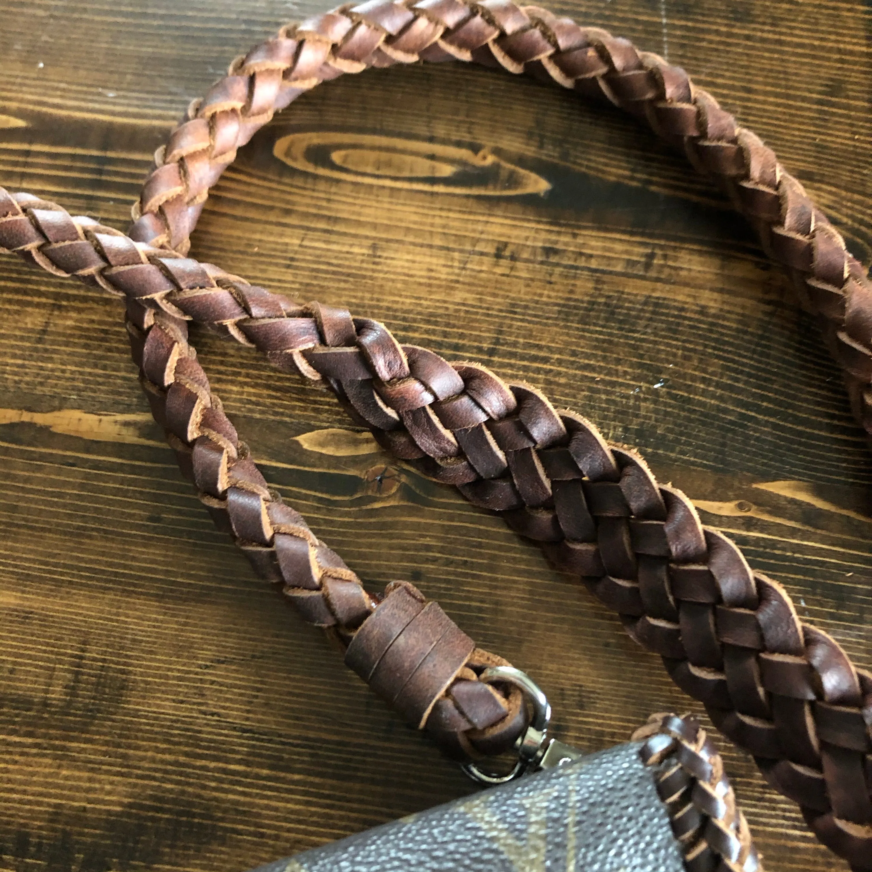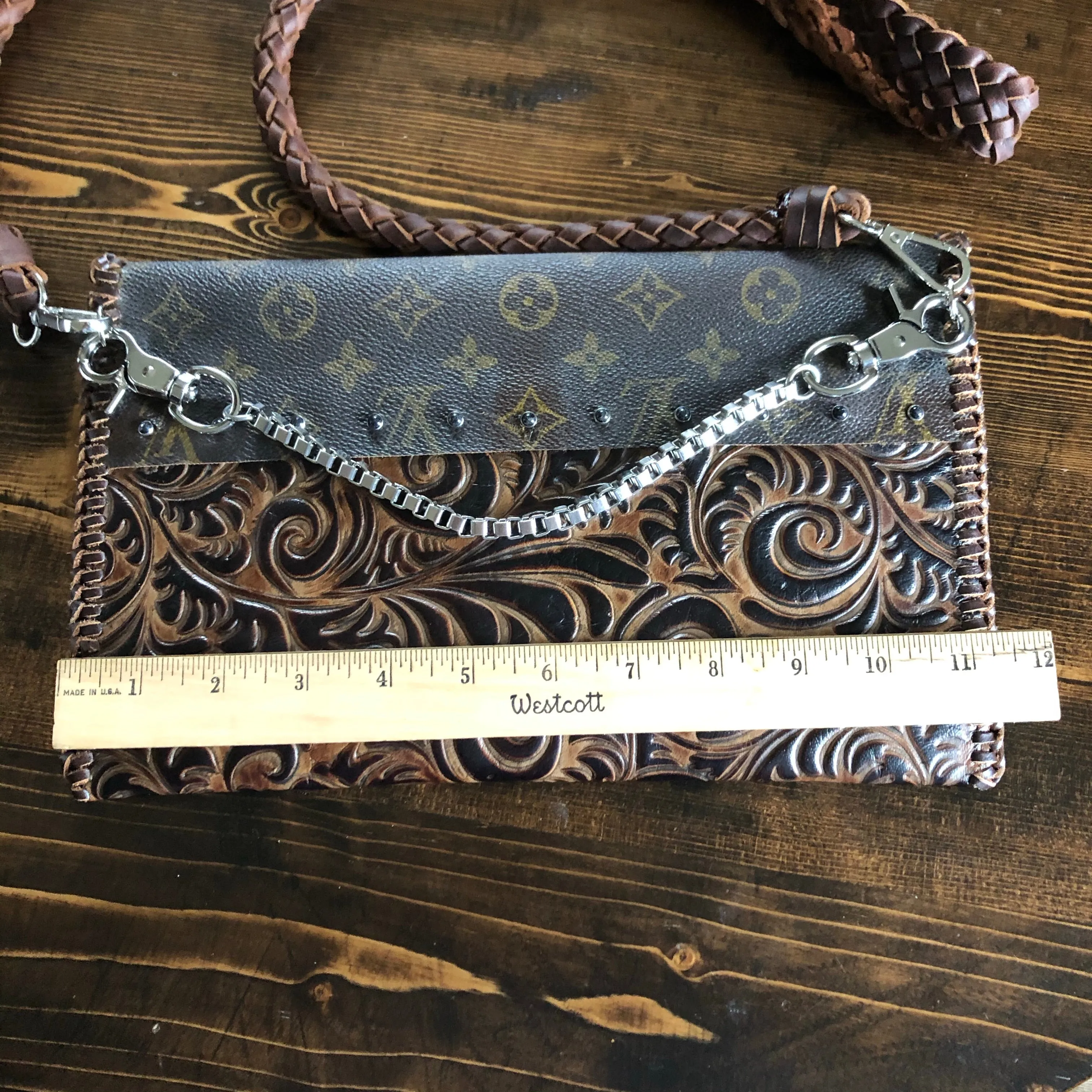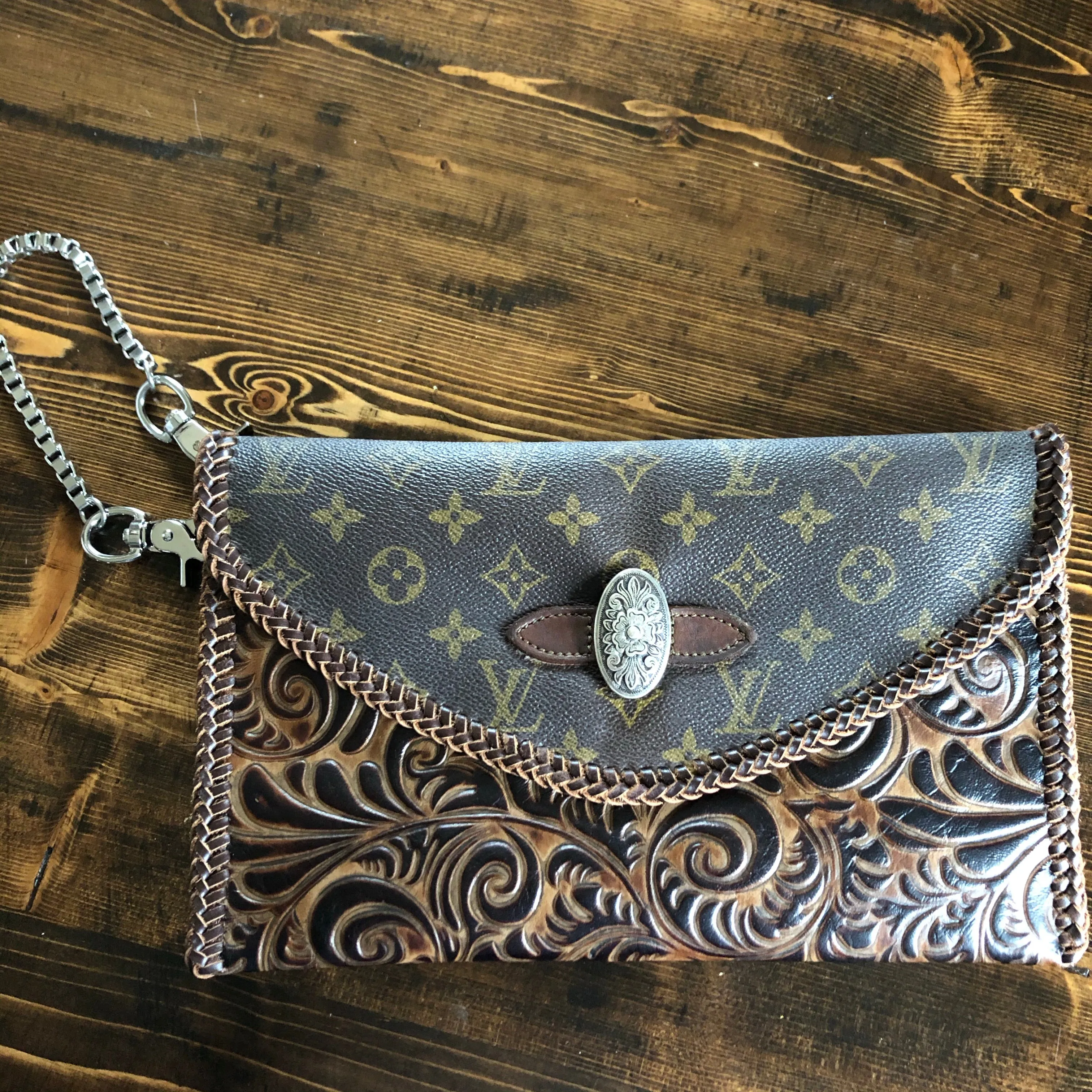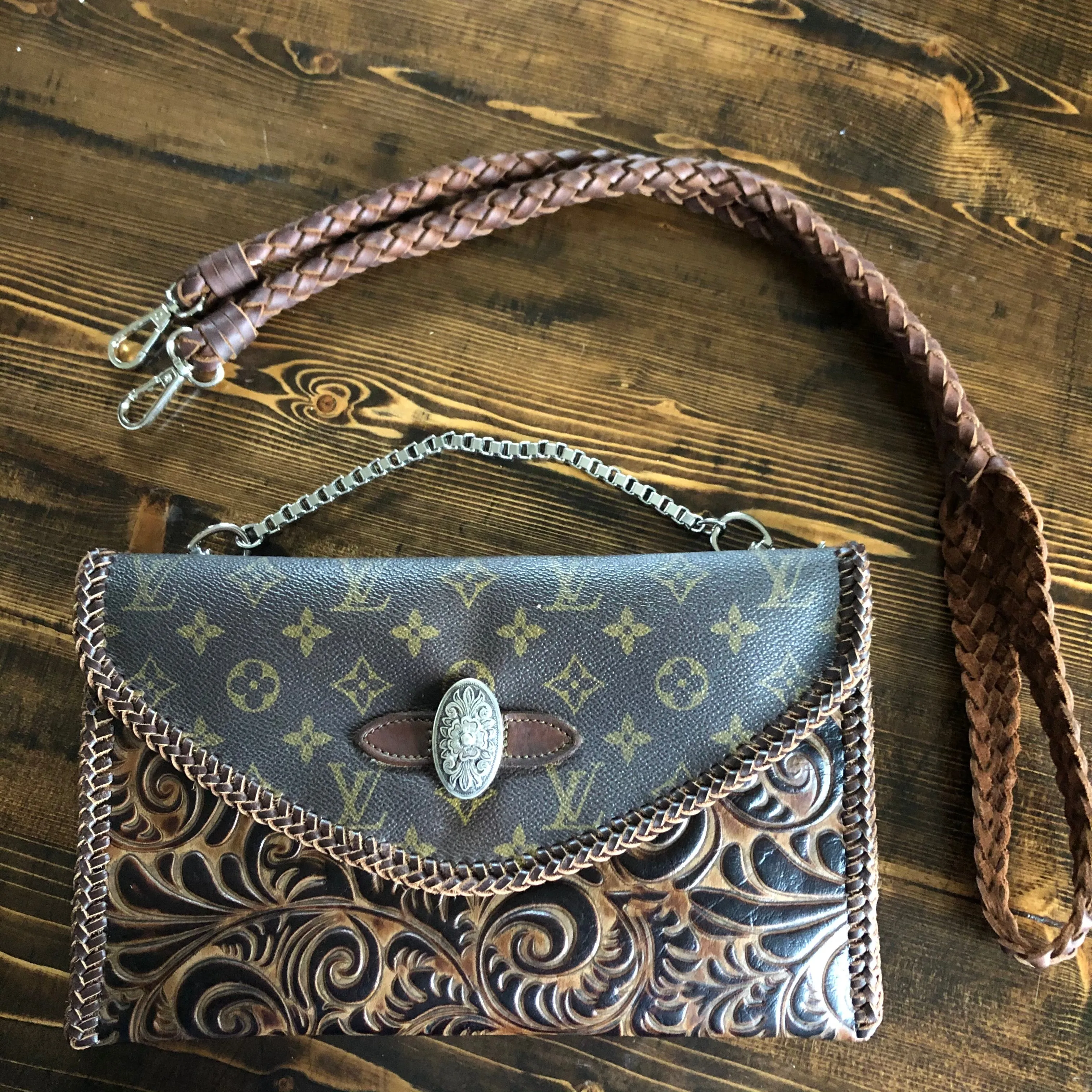 The entire bag is lined with brown leather. The outside edges are brown leather lace which has been stitched by hand. There are two silver D-Rings that hold either a beautiful leather braided strap (49") or a cute shorty silver chain. The leather strap is 6-strand braided brown leather that is flat where it goes across your body, but then transitions into round as it moves to the clasp. The shorty chain can also be clipped to the same ring to make this a wristlet!! Remove them both and carry it as a clutch! A beautiful silver vintage concho shows on the front, hiding a magnetic snap underneath.