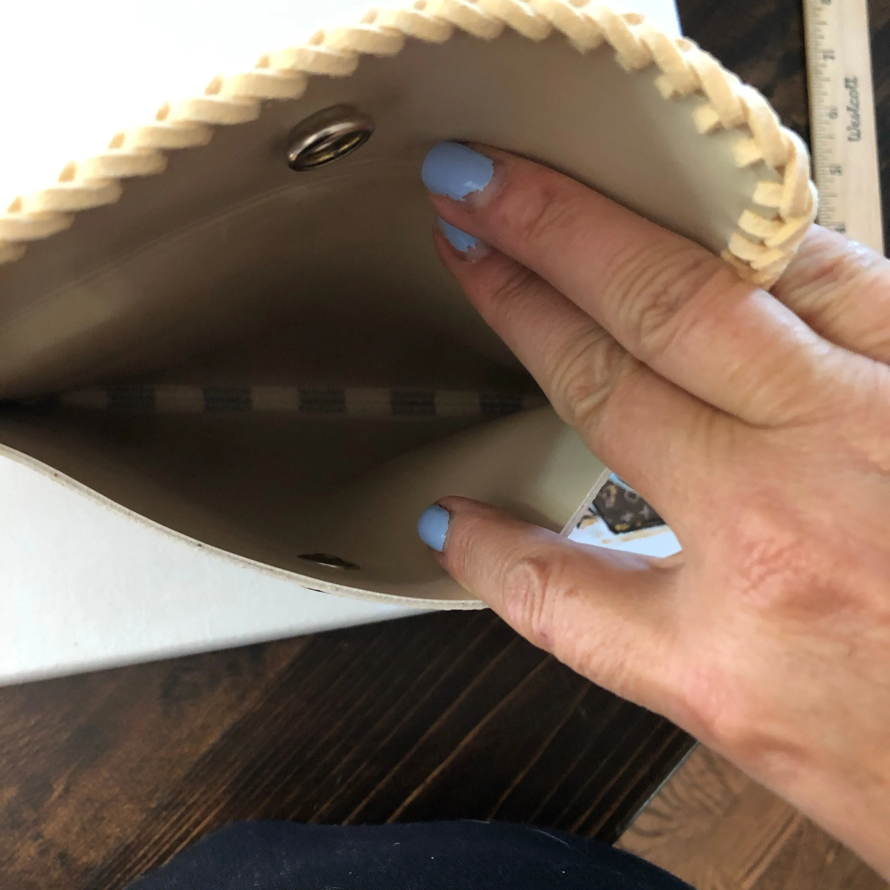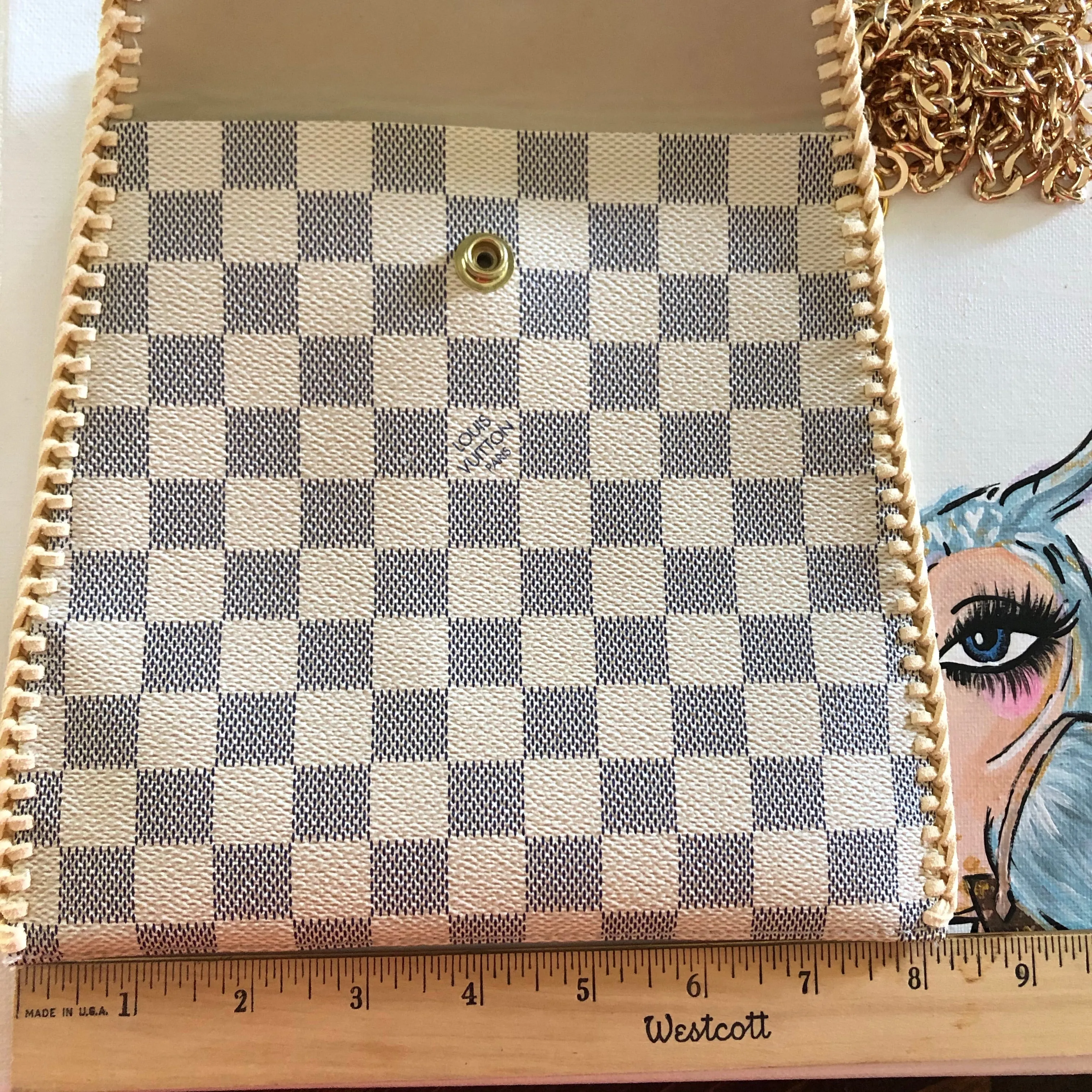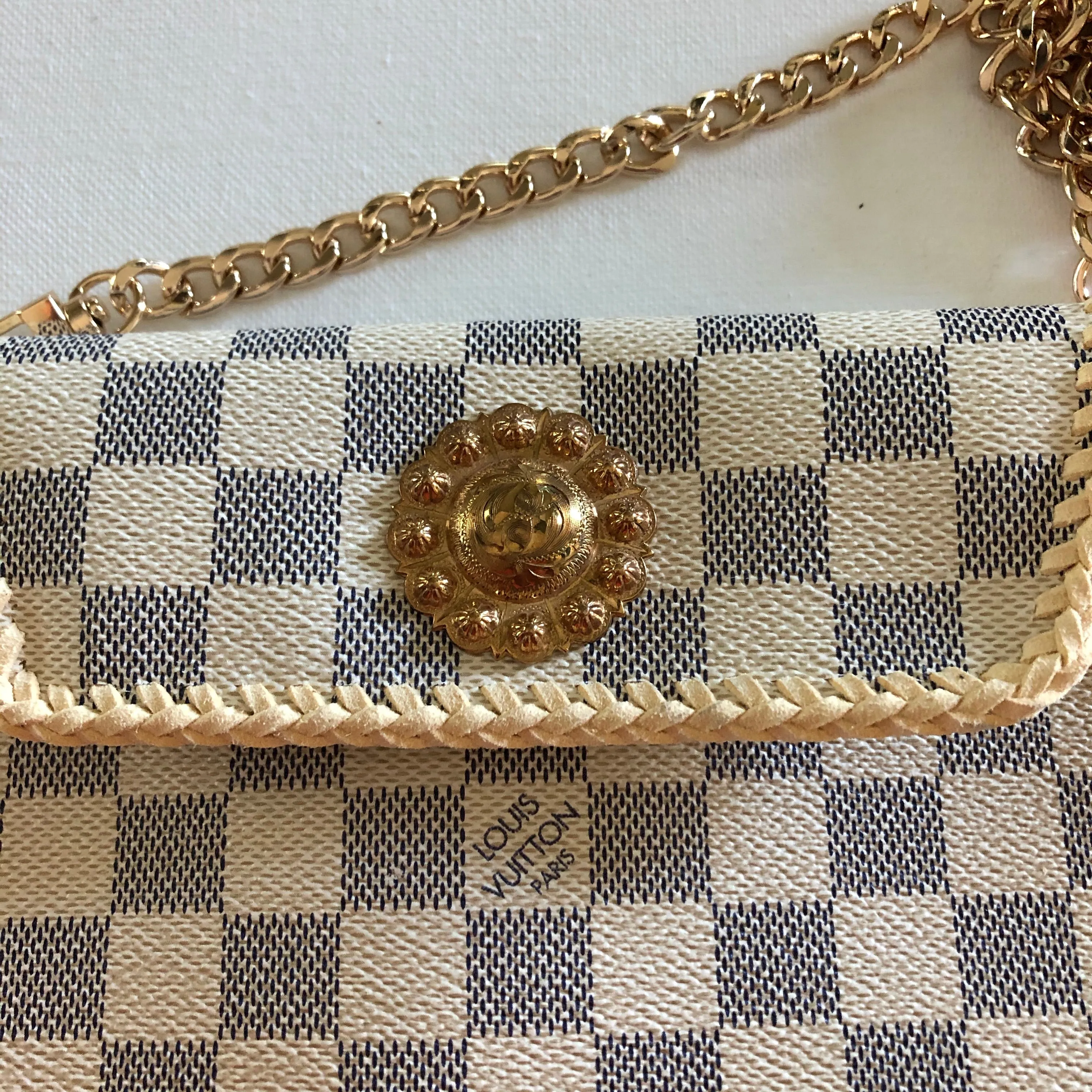 As always, an authentic Louis Vuitton bag was used to make this one-of-a-kind piece. The entire bag is lined in a light colored tan leather, which makes the LV canvas more substantial. The outside edge is a cream colored EcoSoft lace, which has been stitched by hand. A gold 47" crossbody chain is also included. There is a beautiful vintage looking brass concho snap that completes the look.