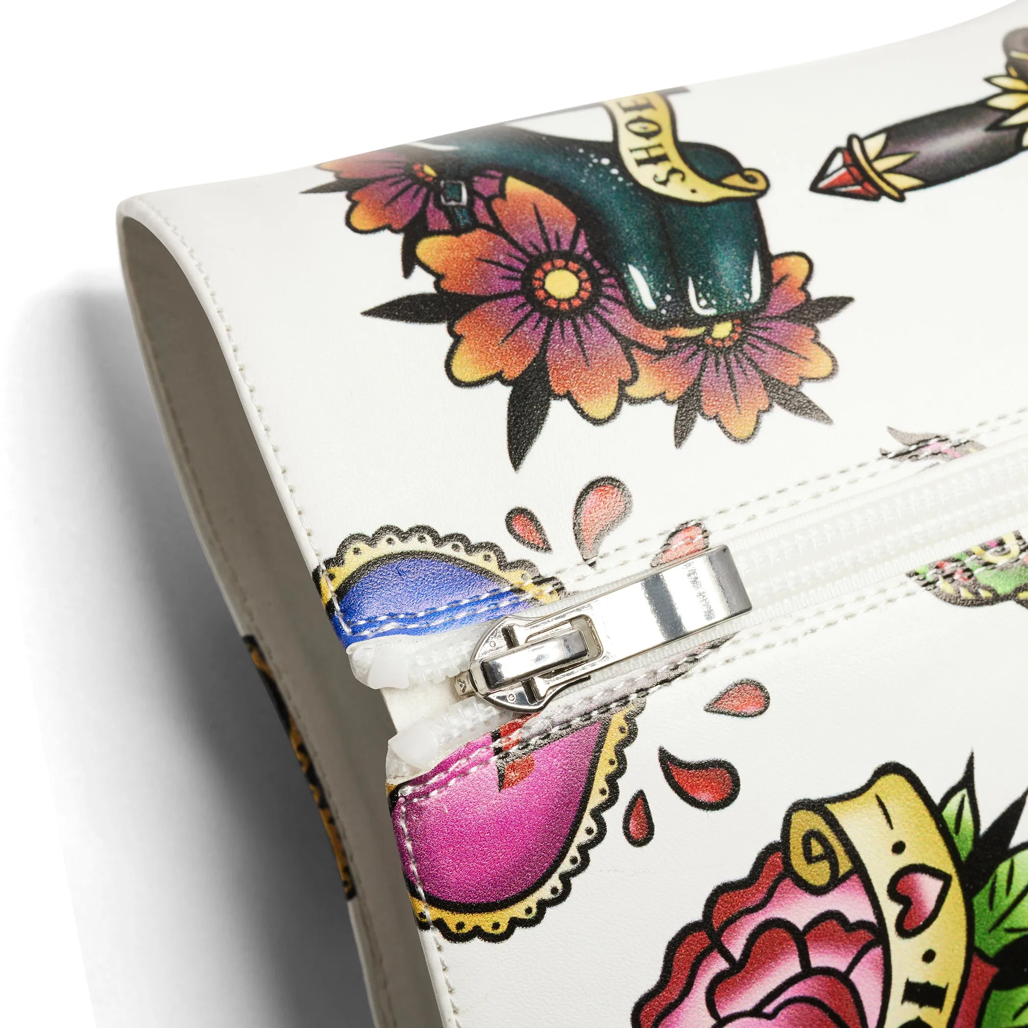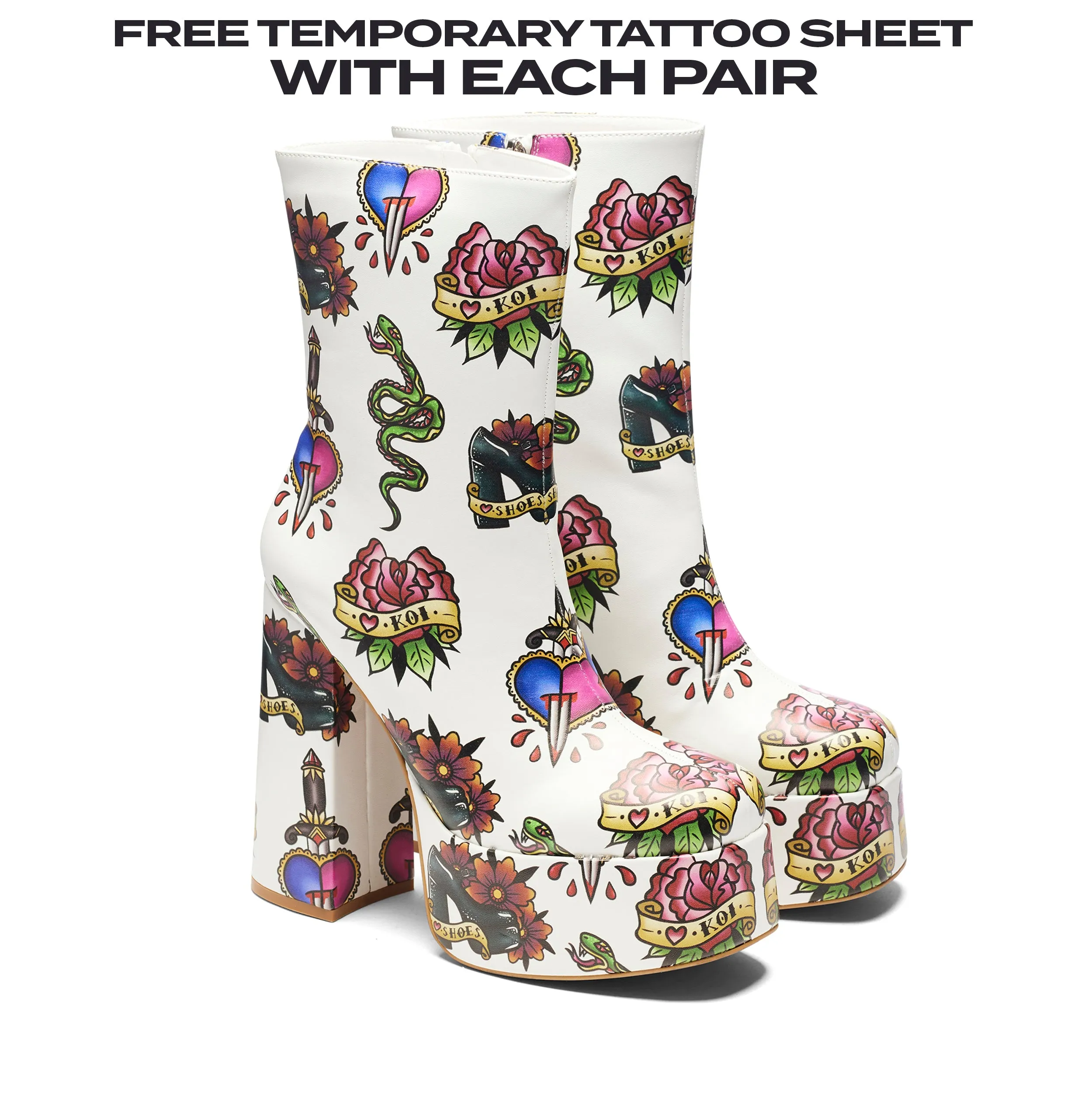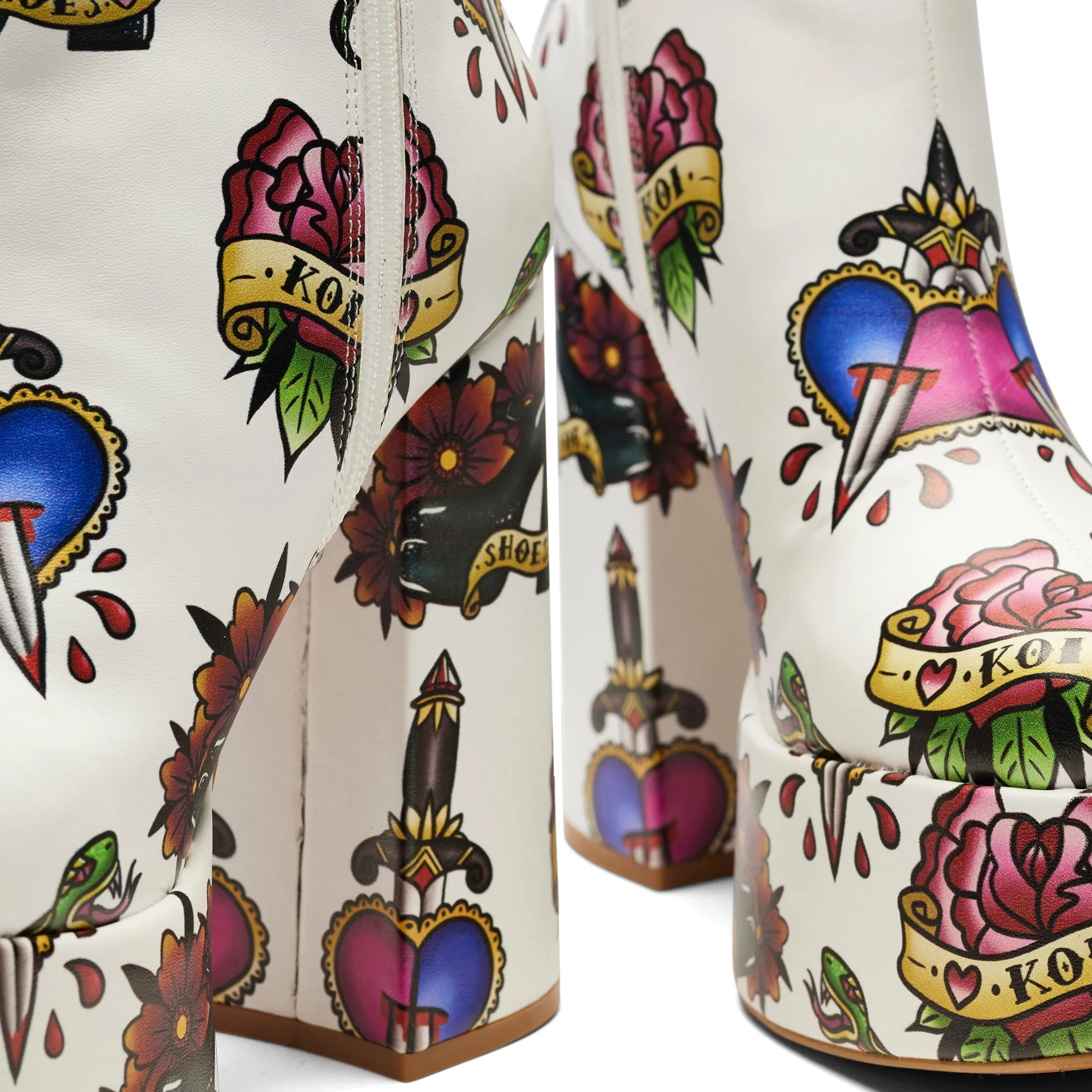 With bold, tattoo-inspired prints, the Verdict of a Serpent & Dagger Heeled Boots make a statement on any occasion. Stomp with confidence in the chunky platform and block heel design, giving you a fierce and edgy look. Perfect for ankle-boot lovers who aren't afraid to stand out.