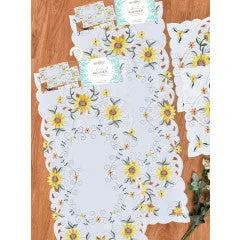 100% Polyester embroidered and cut-work table runner with sunflower design. Design as shown. Choose size option from the drop-down menu below: