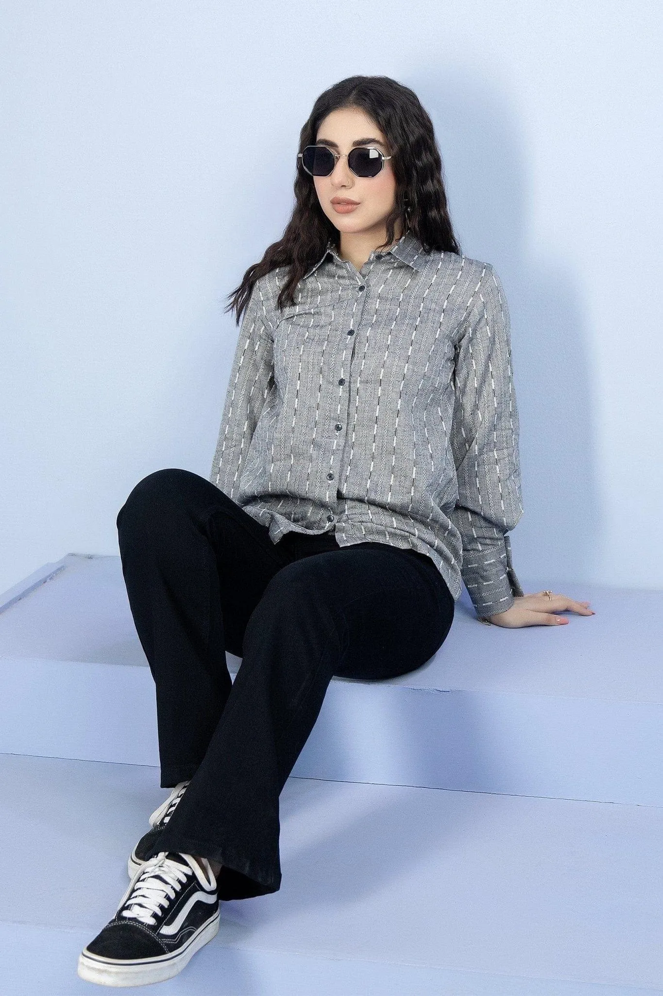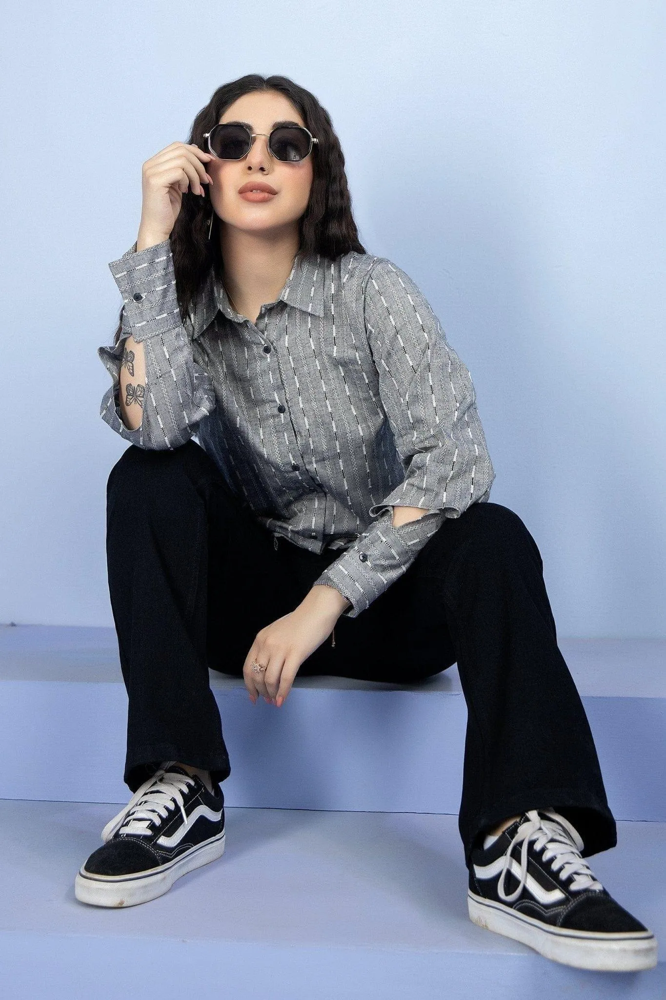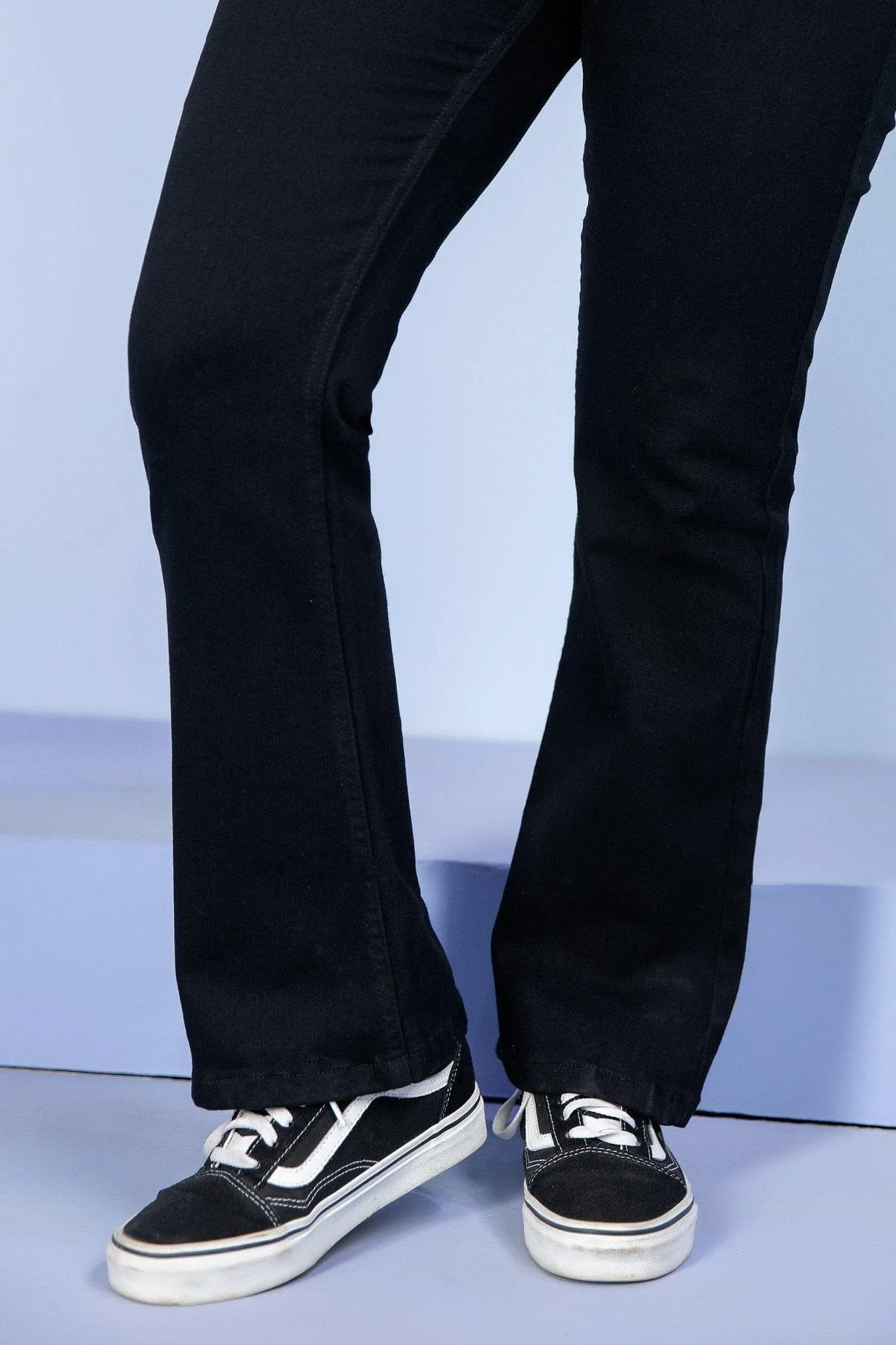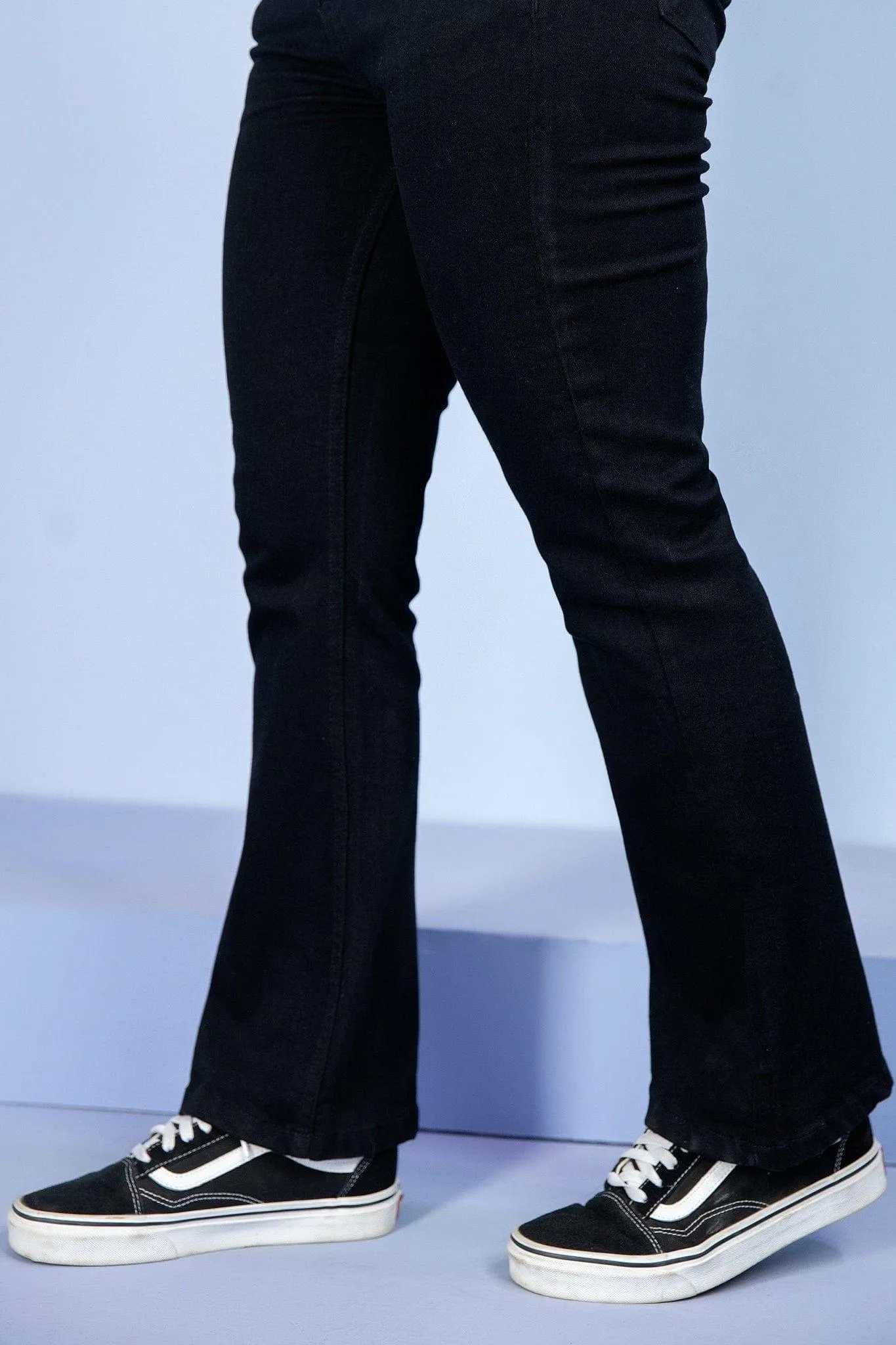 Denim jeans are designed with modern cropped length and high waist cut.
